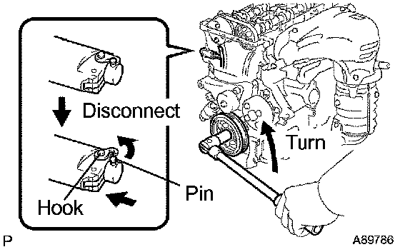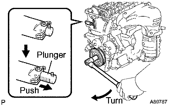 c) Turn the crankshaft counterclockwise and check that the plunger knock pin is disconnected from the hook.