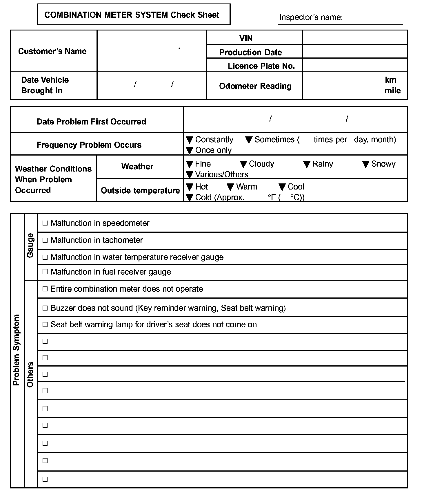 Combination Meter System Check Sheet: