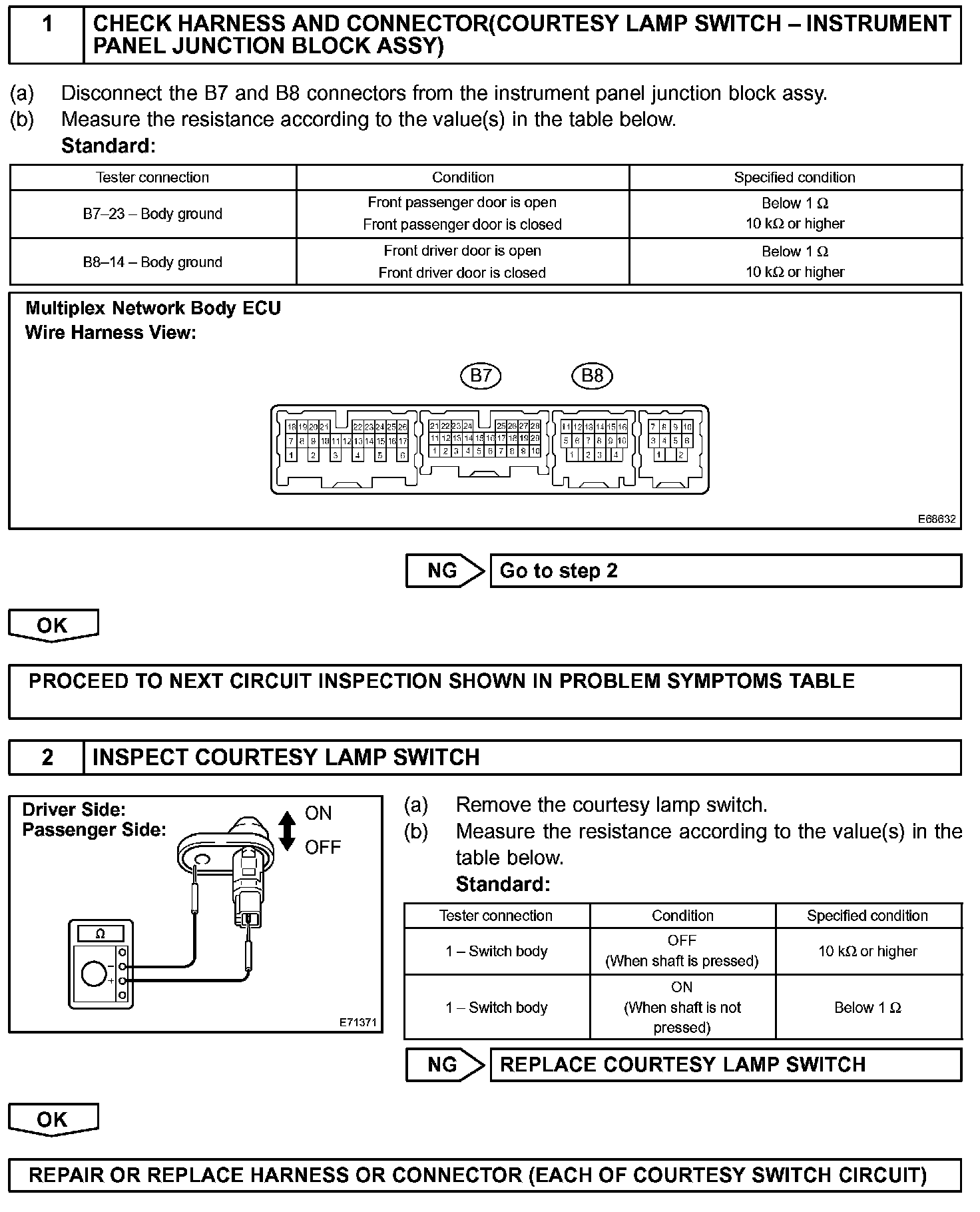 The multiplex network body ECU detects the condition of the door courtesy switch assy.