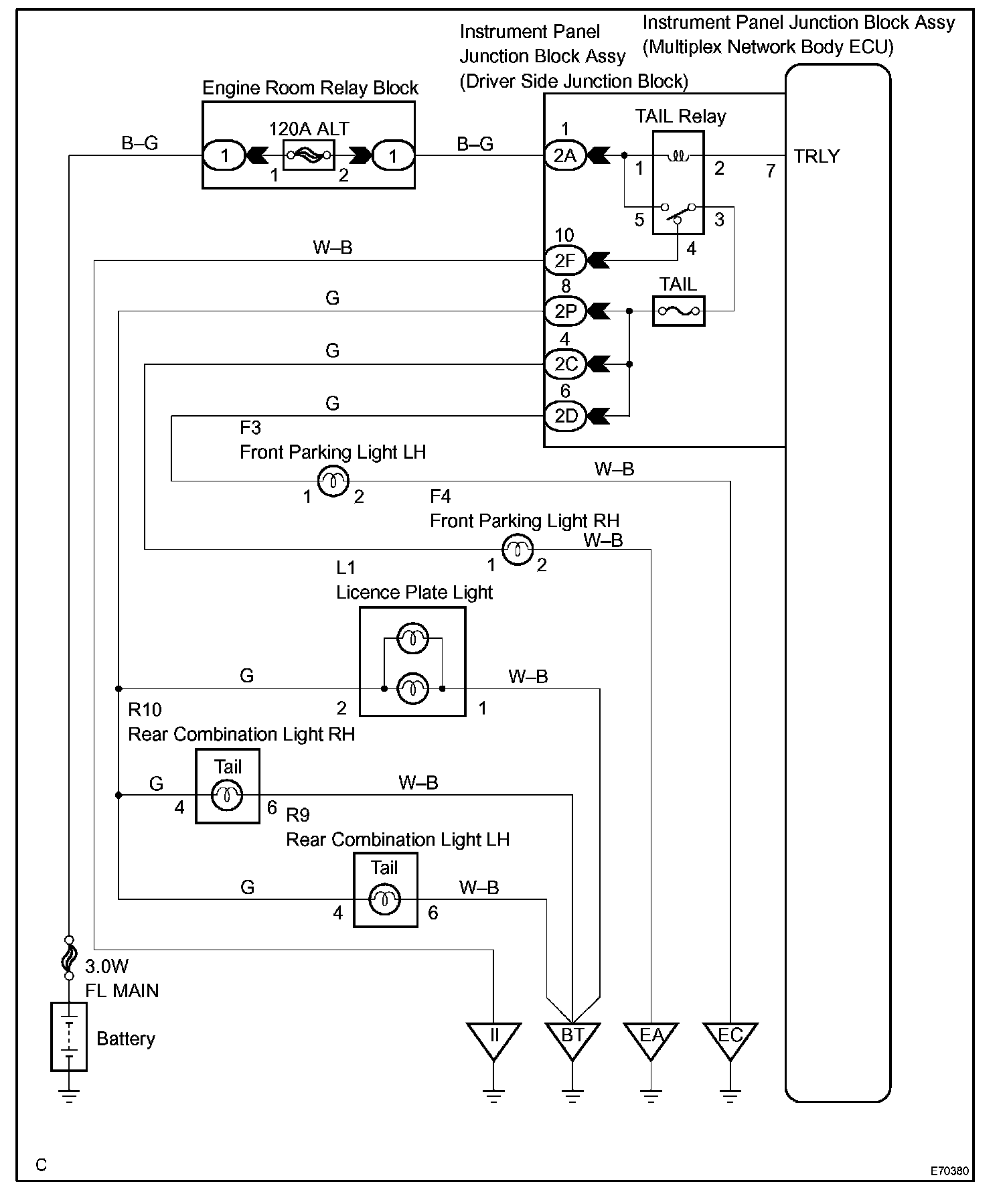 The multiplex network body ECU controls the TAIL relay when a signal is received from the