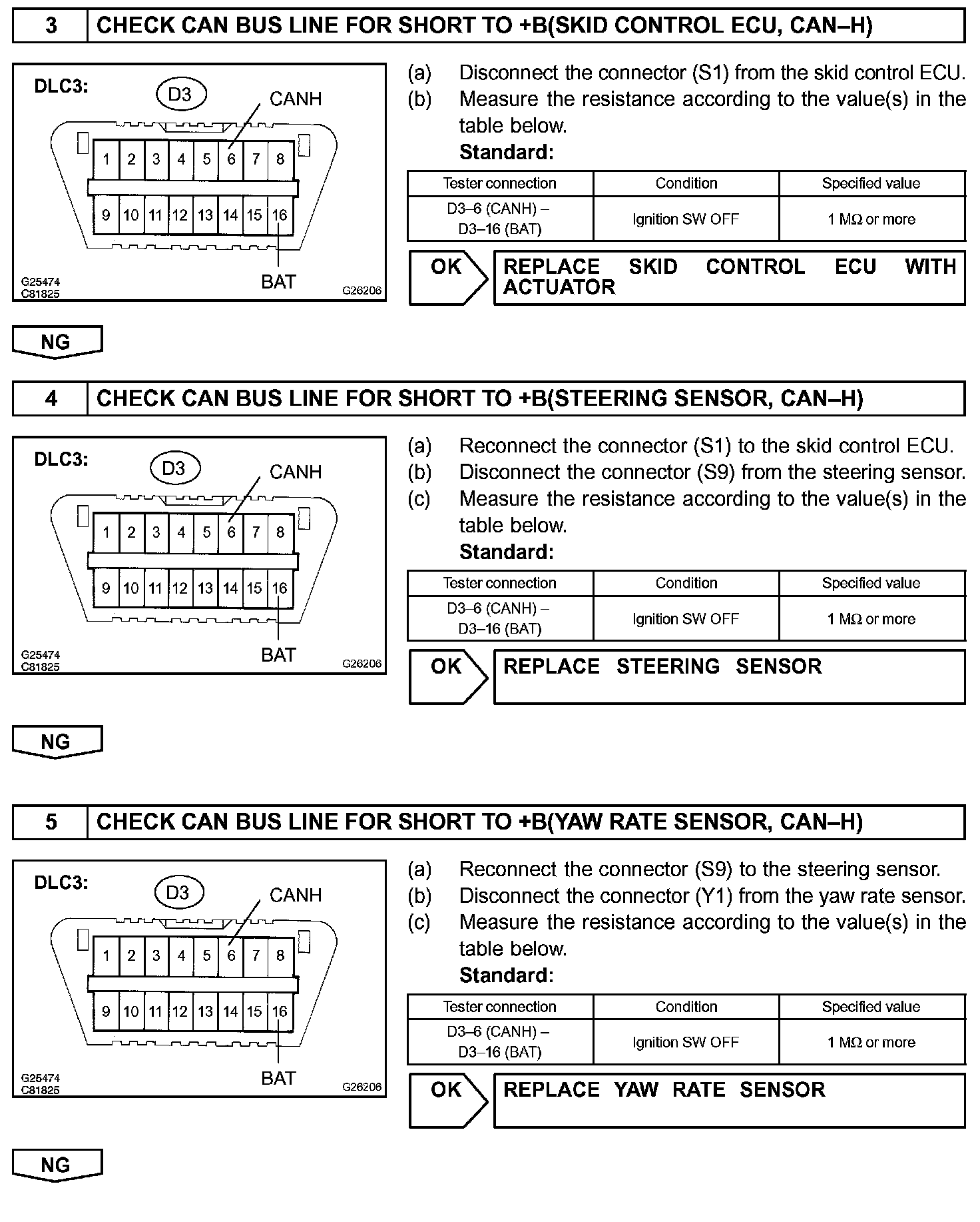 A short to +B is suspected in the CAN bus line when there is continuity between terminals 16 (BAT) and 6 (CANH) of the DLC3.
