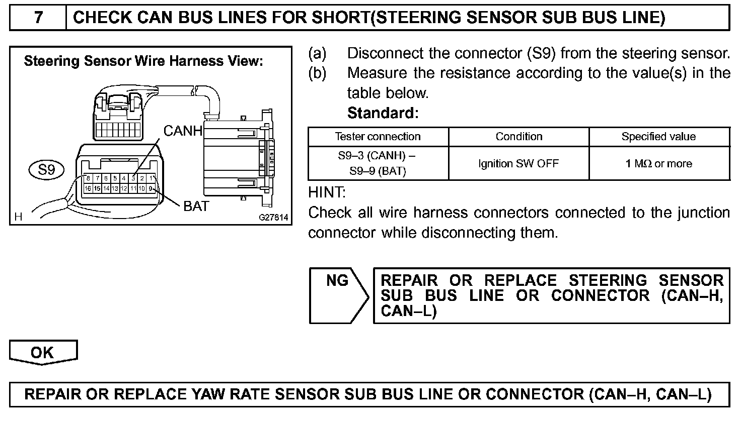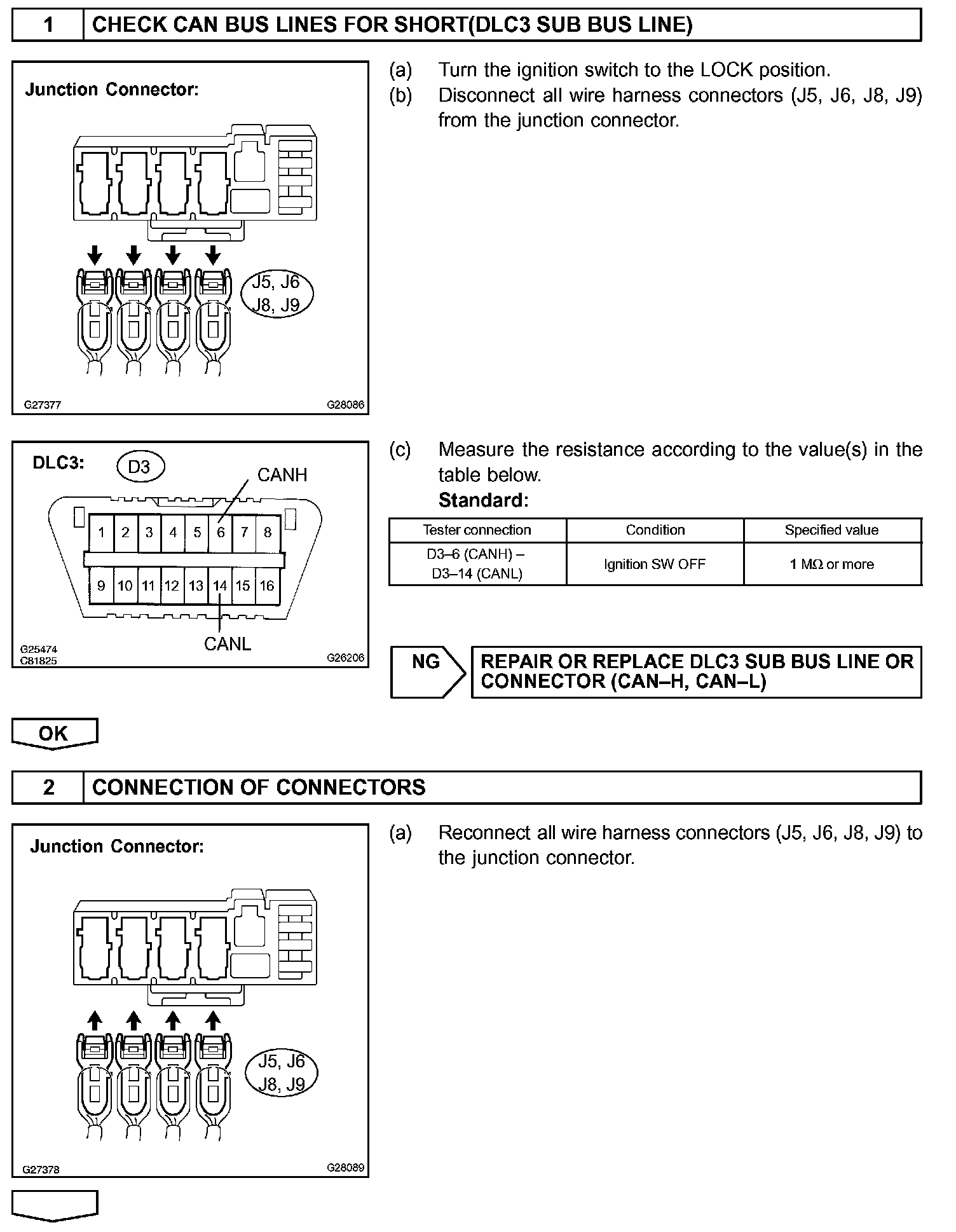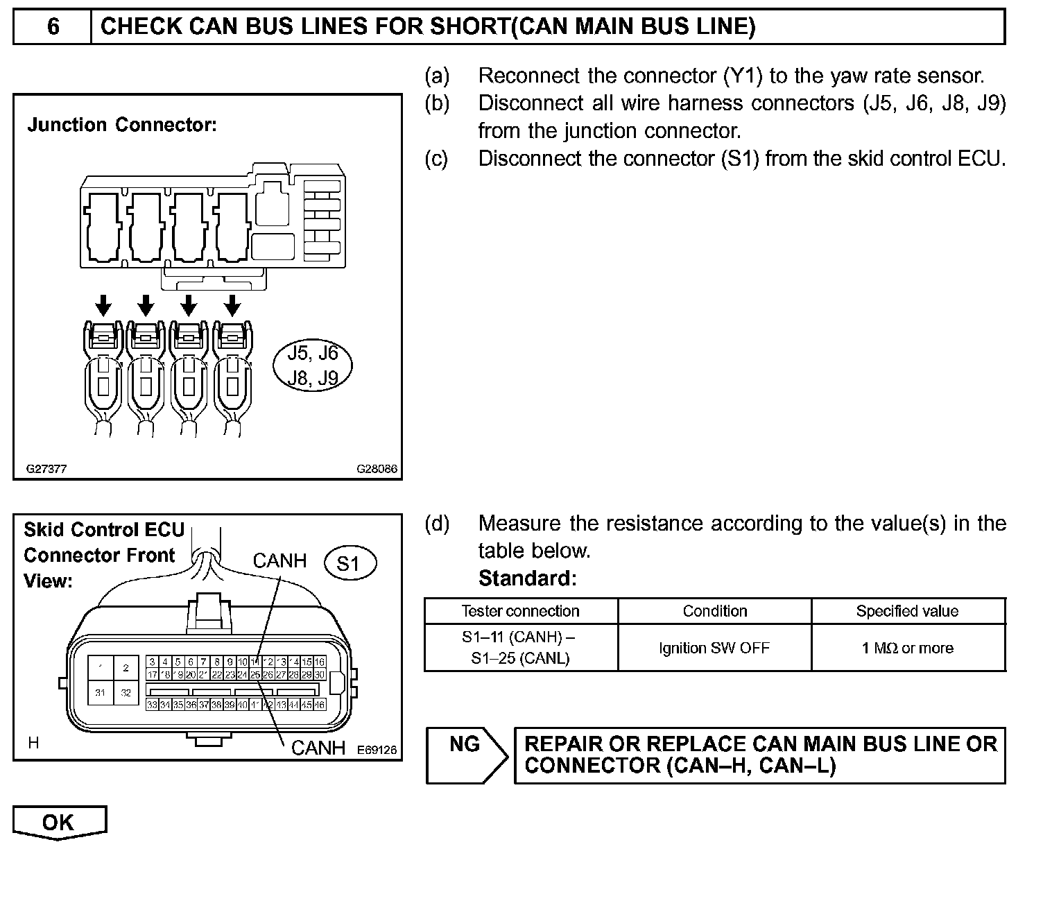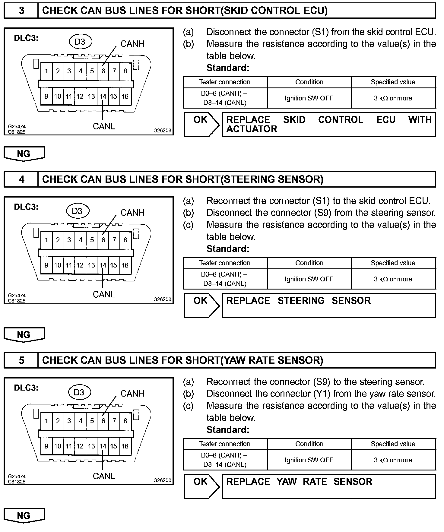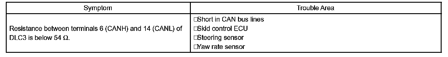 The CAN bus lines are considered to be shorted when the resistance between terminals 6 (CANH) and 14 (CANL) of the DLC3 is below 54 Ohm.