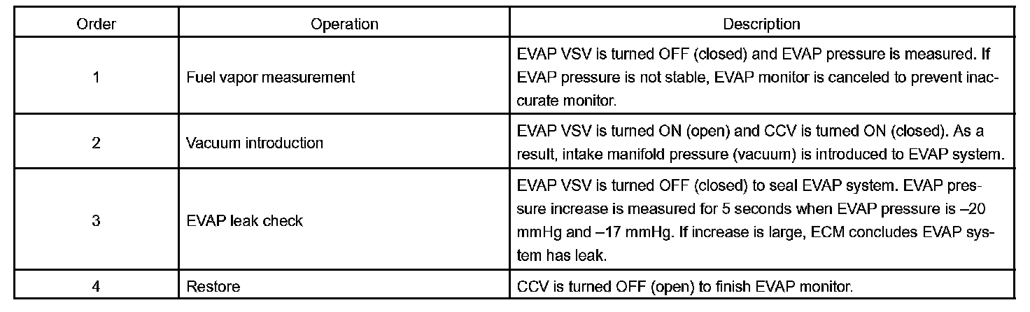 The EVAP monitor's purpose is to check for EVAP leaks and EVAP VSV and CCV malfunctions. The monitor performs the check by first introducing the intake manifold's negative pressure (vacuum) to the EVAP system. Then, the monitor records change in the EVAP system's pressure levels. The monitor runs when the following conditions are met: