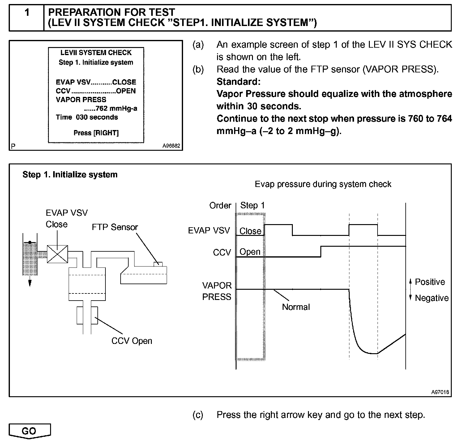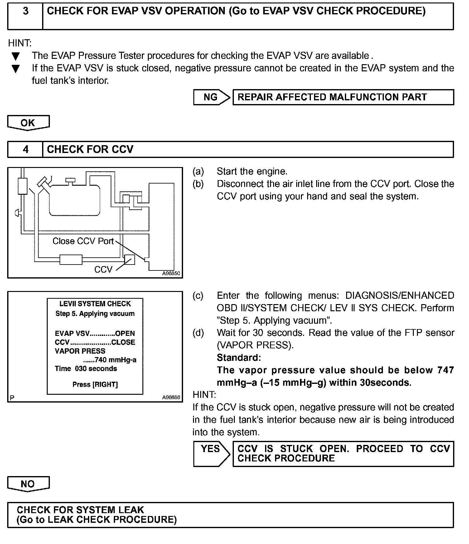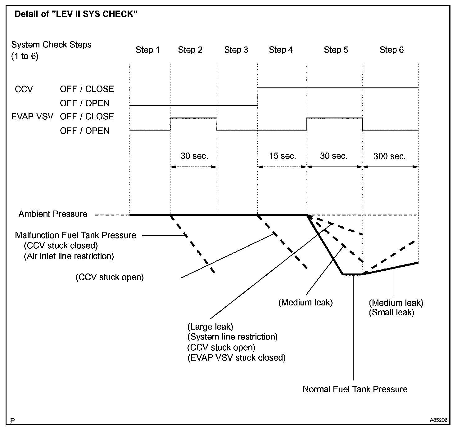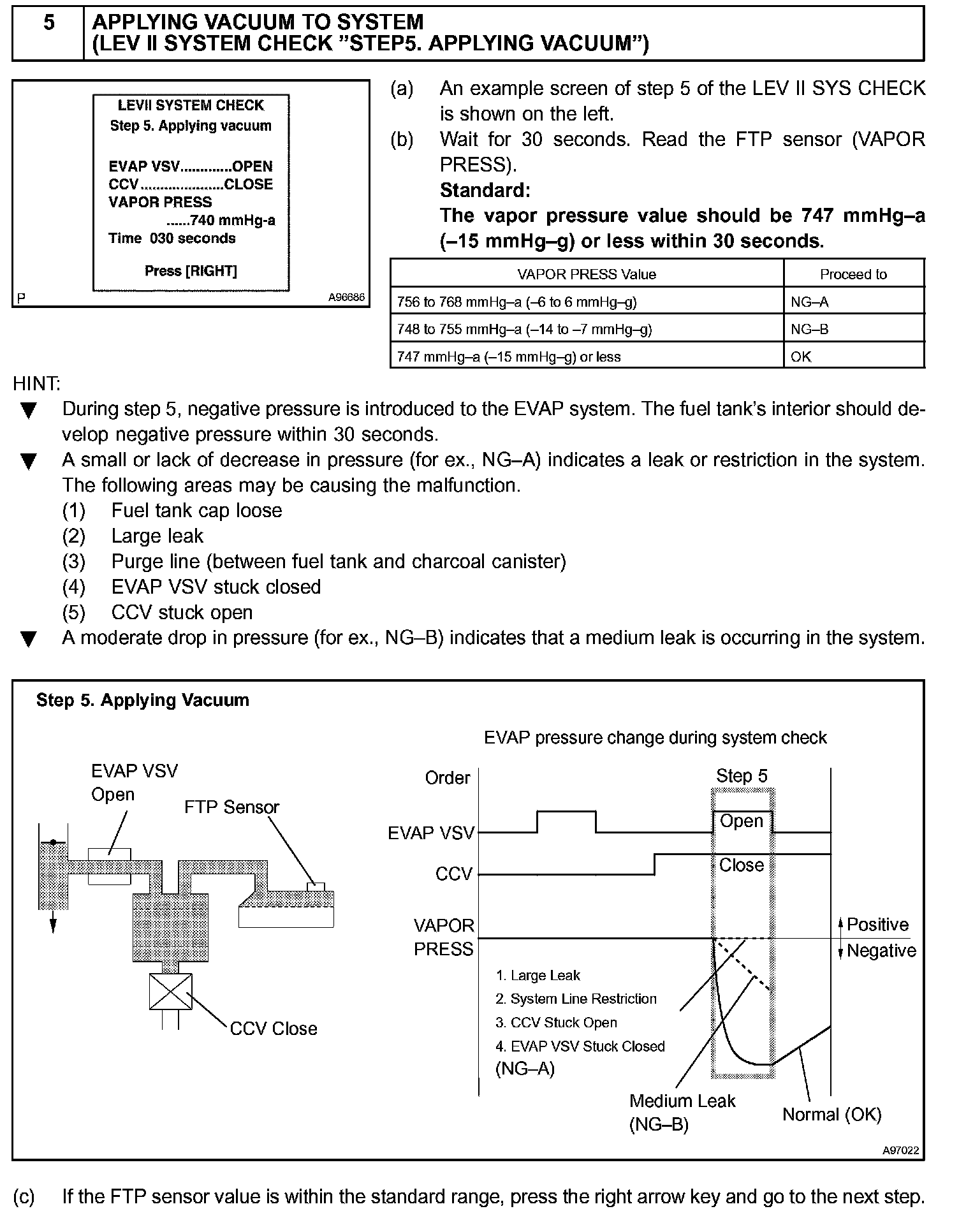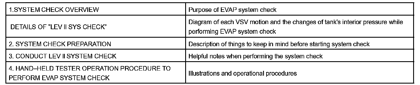The EVAP system LEV II SYS CHECK is designed to confirm proper operation of the EVAP VSV and CCV, and determine if a leak or restriction is present in the system. During the check, the EVAP VSV and CCV are controlled in specific patterns to create negative pressure and/or restore ambient pressure to EVAP system. The hand-held tester displays the FTP sensor's value as these changes occur. By comparing the changes in the FTP sensor value to the expected results, suspect areas can be identified.