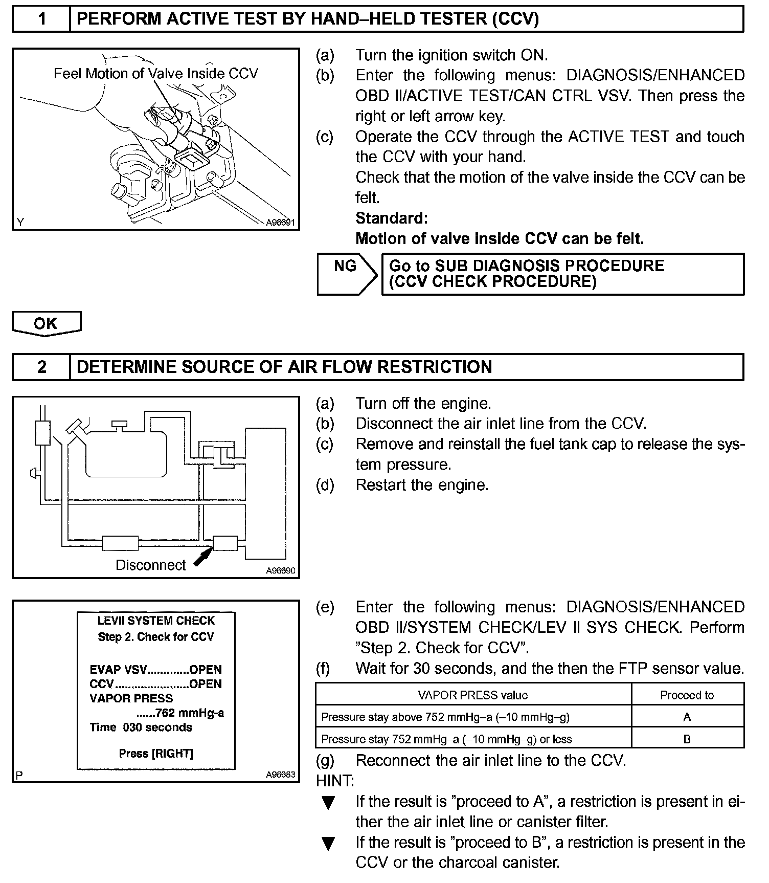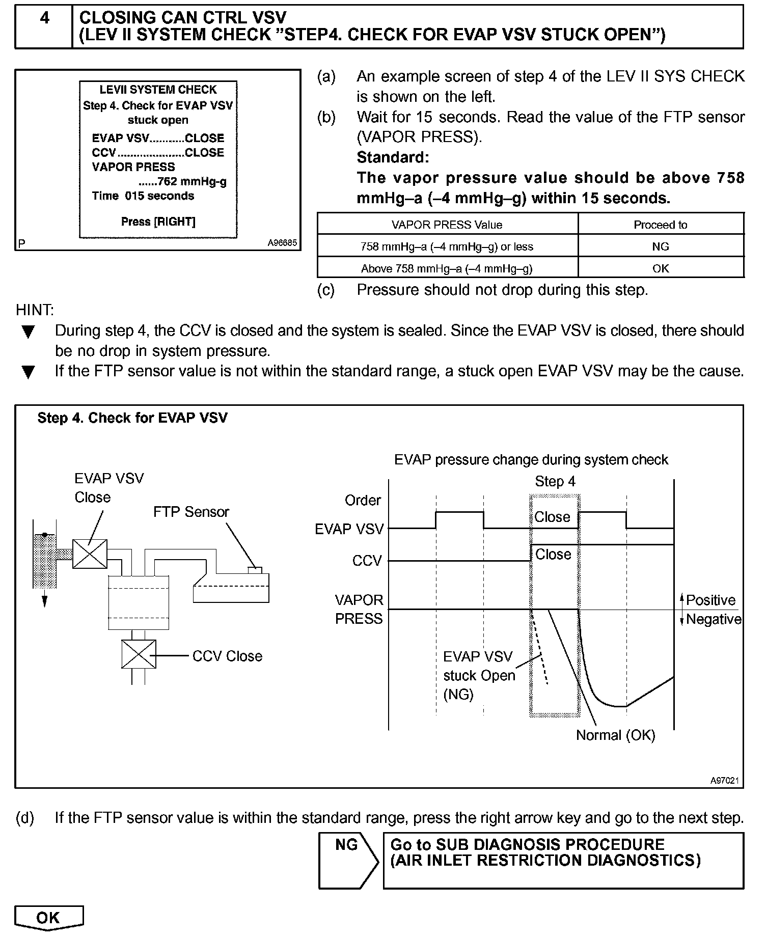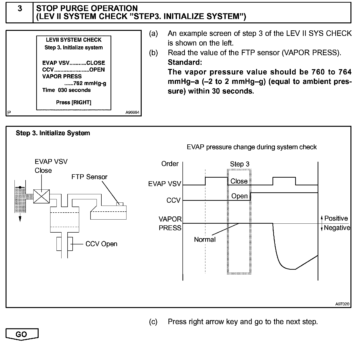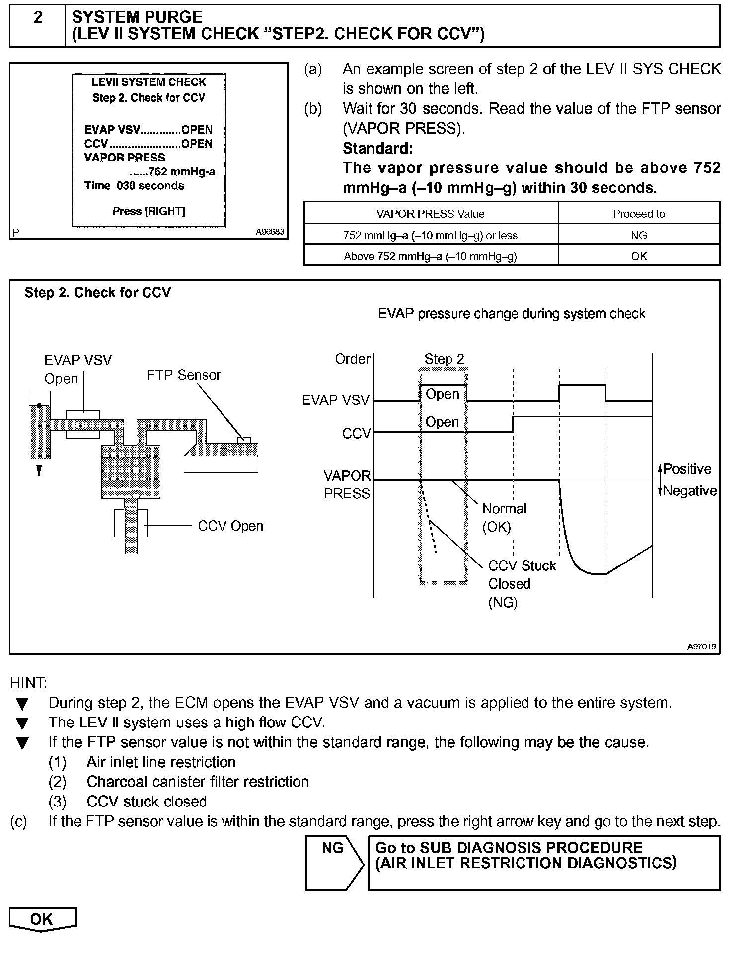 The EVAP system LEV II SYS CHECK is designed to confirm proper operation of the EVAP VSV and CCV, and determine if a leak or restriction is present in the system. During the check, the EVAP VSV and CCV are controlled in specific patterns to create negative pressure and/or restore ambient pressure to EVAP system. The hand-held tester displays the FTP sensor's value as these changes occur. By comparing the changes in the FTP sensor value to the expected results, suspect areas can be identified.