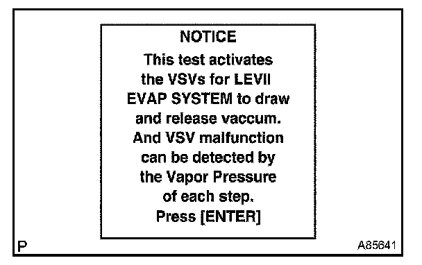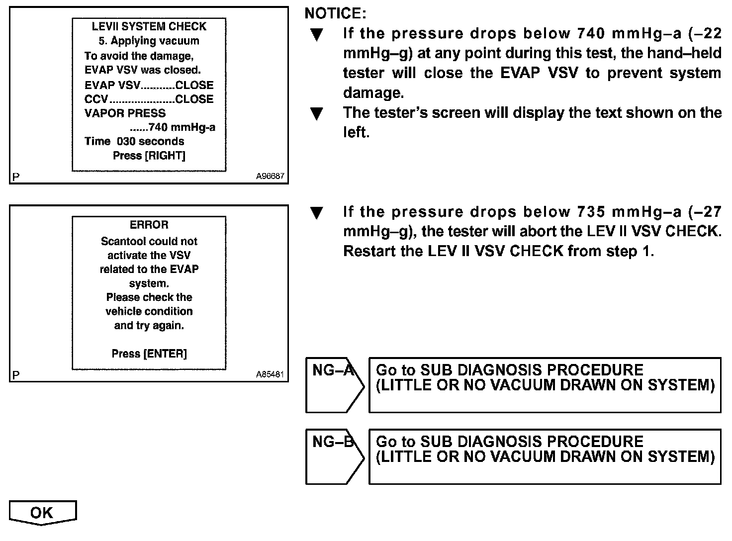 NOTE: If the pressure drops below 740 mmHg-a (-22 mmHg-g) at any point during this test, the hand-held tester will close the EVAP VSV to prevent system damage.