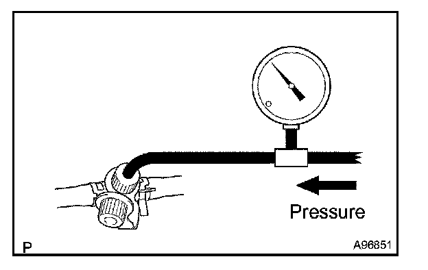 5. From the EVAP service port, apply 786 to 790 mmHg-a (24 to 28 mmHg-g) of pressure. Do not apply pressure continuously for more than 45 seconds.