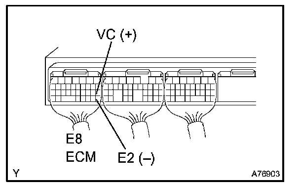 2. Measure the voltage between terminals E8-18 (VC) and E8-28 (E2) of the ECM connector.