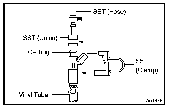 4. Connect SST (union and hose) to the injector, and hold the injector and union with SST (clamp).