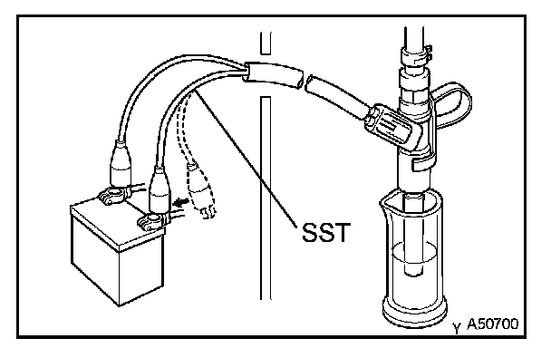 7. Connect SST (wire) to the injector and the battery for 15 seconds, and measure the injection volume with a graduated cylinder. Test each injector 2 or 3 times.