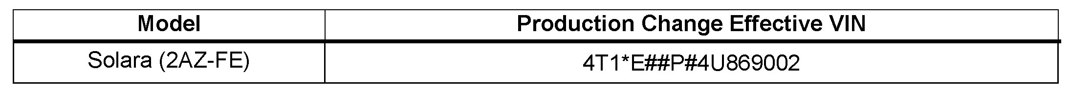 - 2002 - 2004 model year Solara vehicles equipped with the 2AZ-FE engine produced BEFORE the Production Change Effective VINs shown below.
