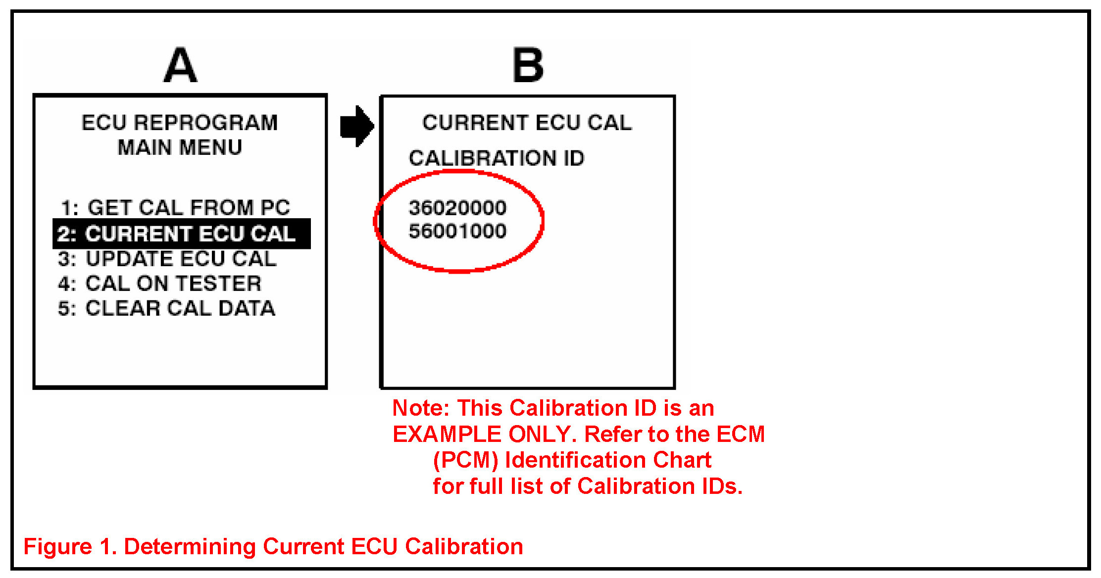 2. Connect the Diagnostic Tester to the vehicle and select "CURRENT ECU CAL" from the "ECU REPROGRAM MAIN MENU." To determine the vehicle's current ECM calibration, Figure 1 shown.