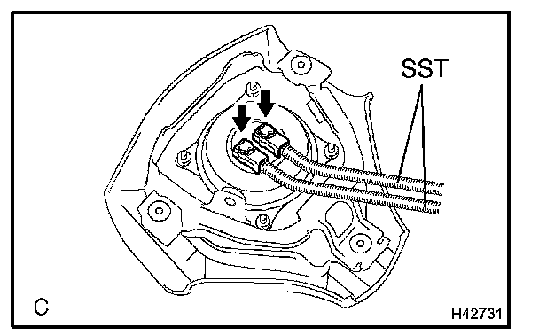 4. Face the upper surface of the horn button assy upward. Separately tie the left and right sides of the horn button assy to the disc wheel through the hub nut holes. Position the SST connector so that it hangs downward through a hub hole in the disc wheel.