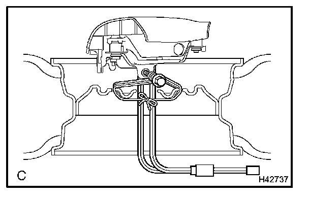 c. Using a service-purpose wire harness for the vehicle, tie down the horn button assy to the disc wheel.