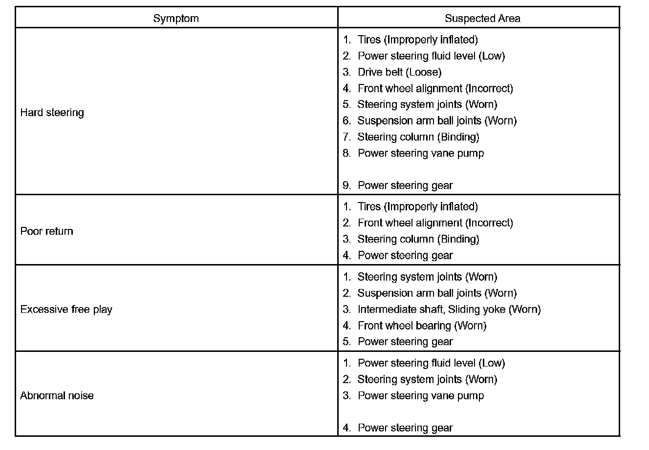 PROBLEM SYMPTOMS TABLEUse the table provided to help determine the cause of the problem. The numbers indicate the priority of the likely causes of the problem. Check each part in order. If necessary, repair or replace these parts.