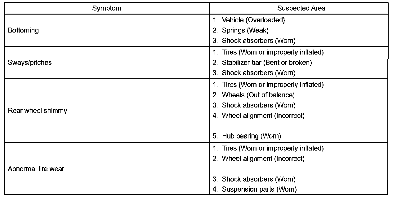 Use the table provided, with suspected areas listed in numerical order, to determine the cause of the problem. Inspect and repair or replace parts necessary according to the applicable service procedures.
