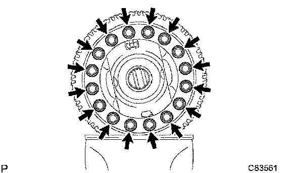 b) Remove the 16 bolts. Using a plastic hammer, remove the front differential case.