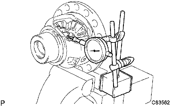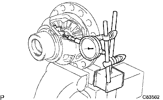 b) If backlash is out of specification, select another front differential side gear thrust washer and adjust it.
