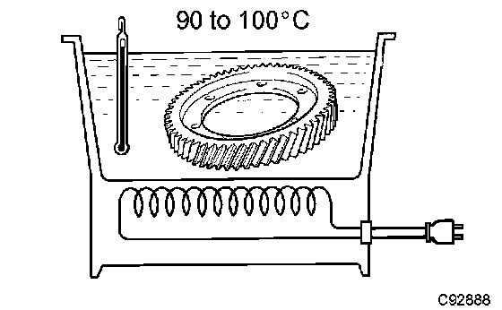 a) Using a heater, heat the front differential ring gear to 90 to 100°C (194.0 to 230.0°F).