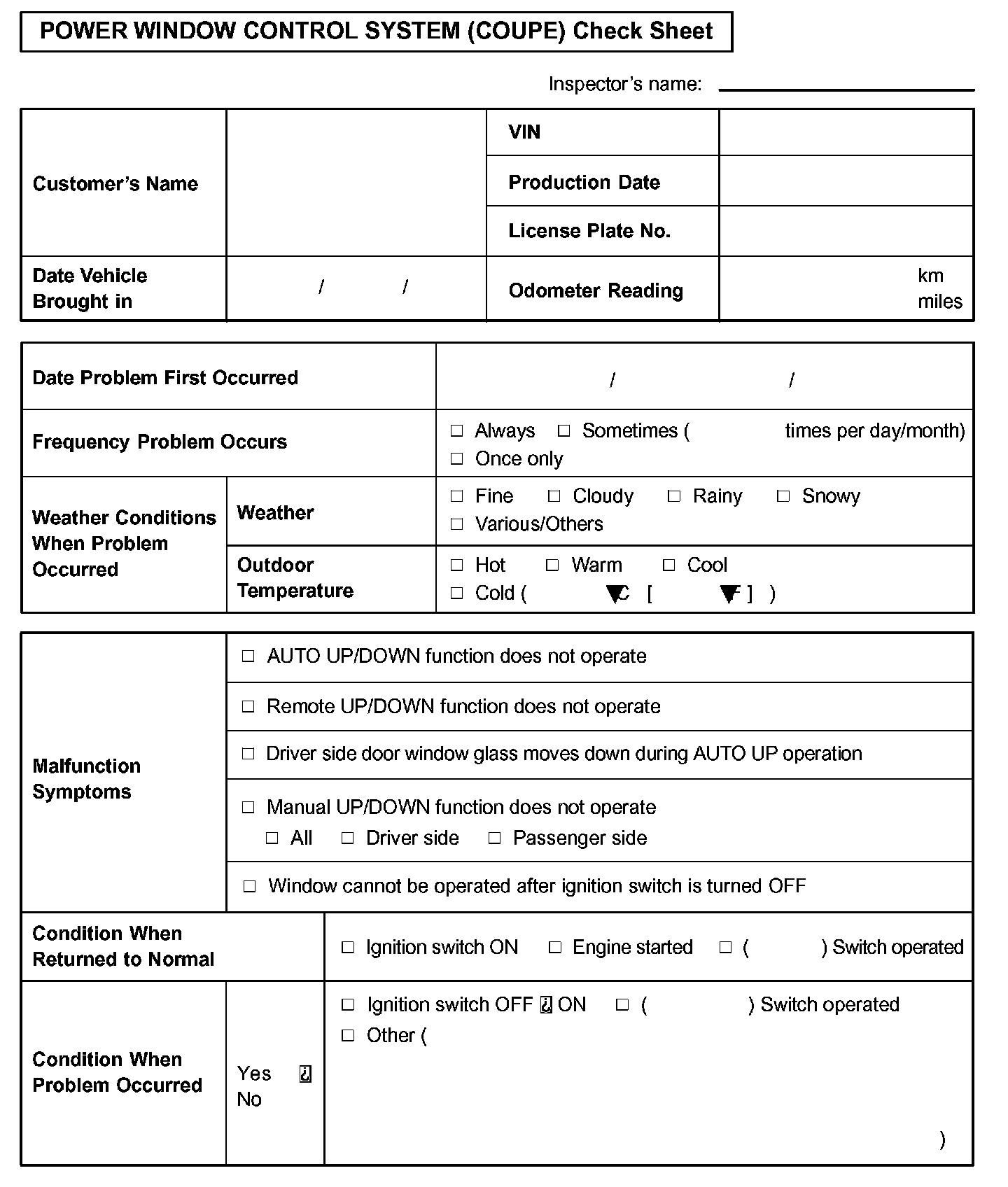 Power Window Control System (Coupe) Check Sheet: