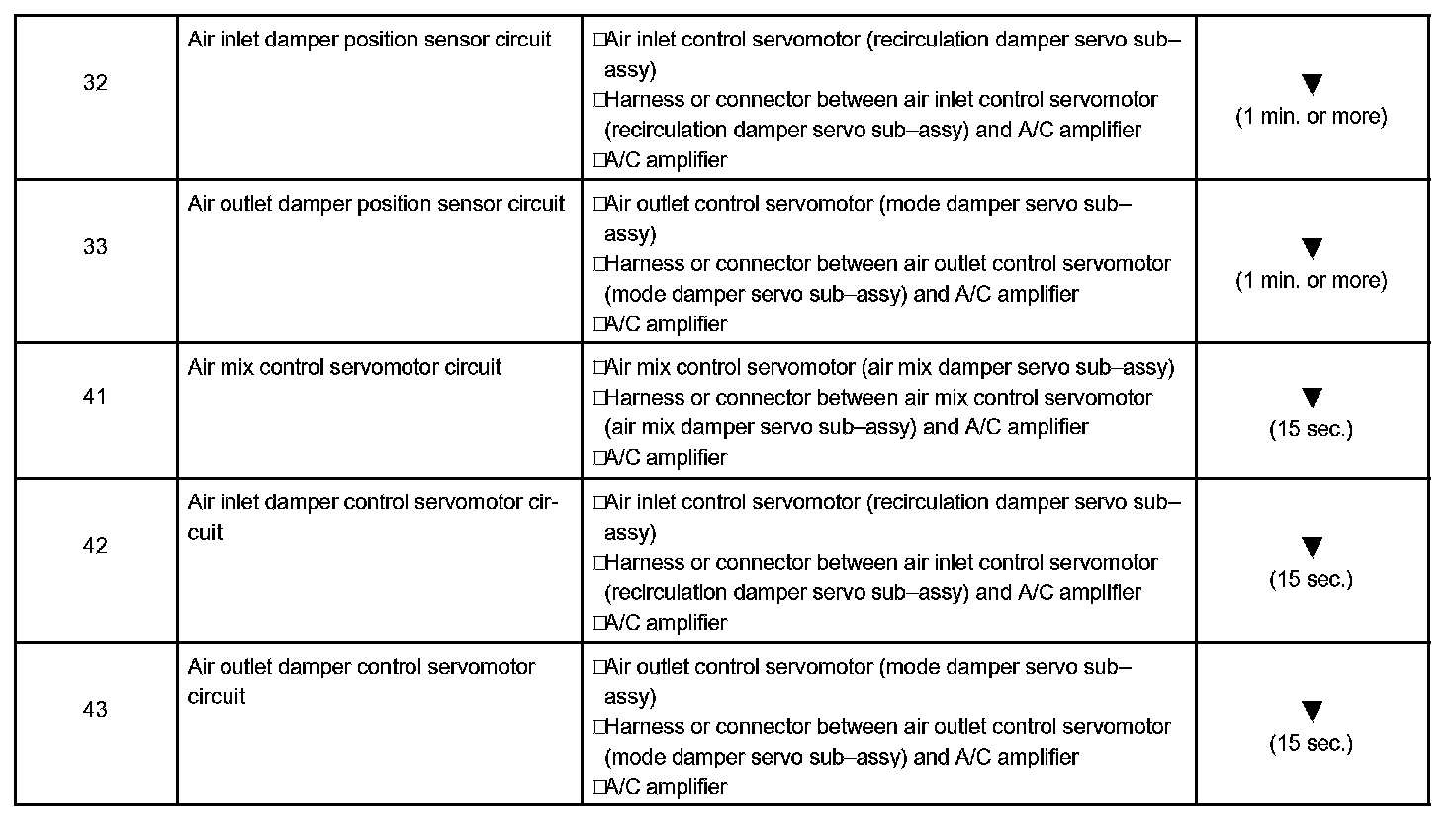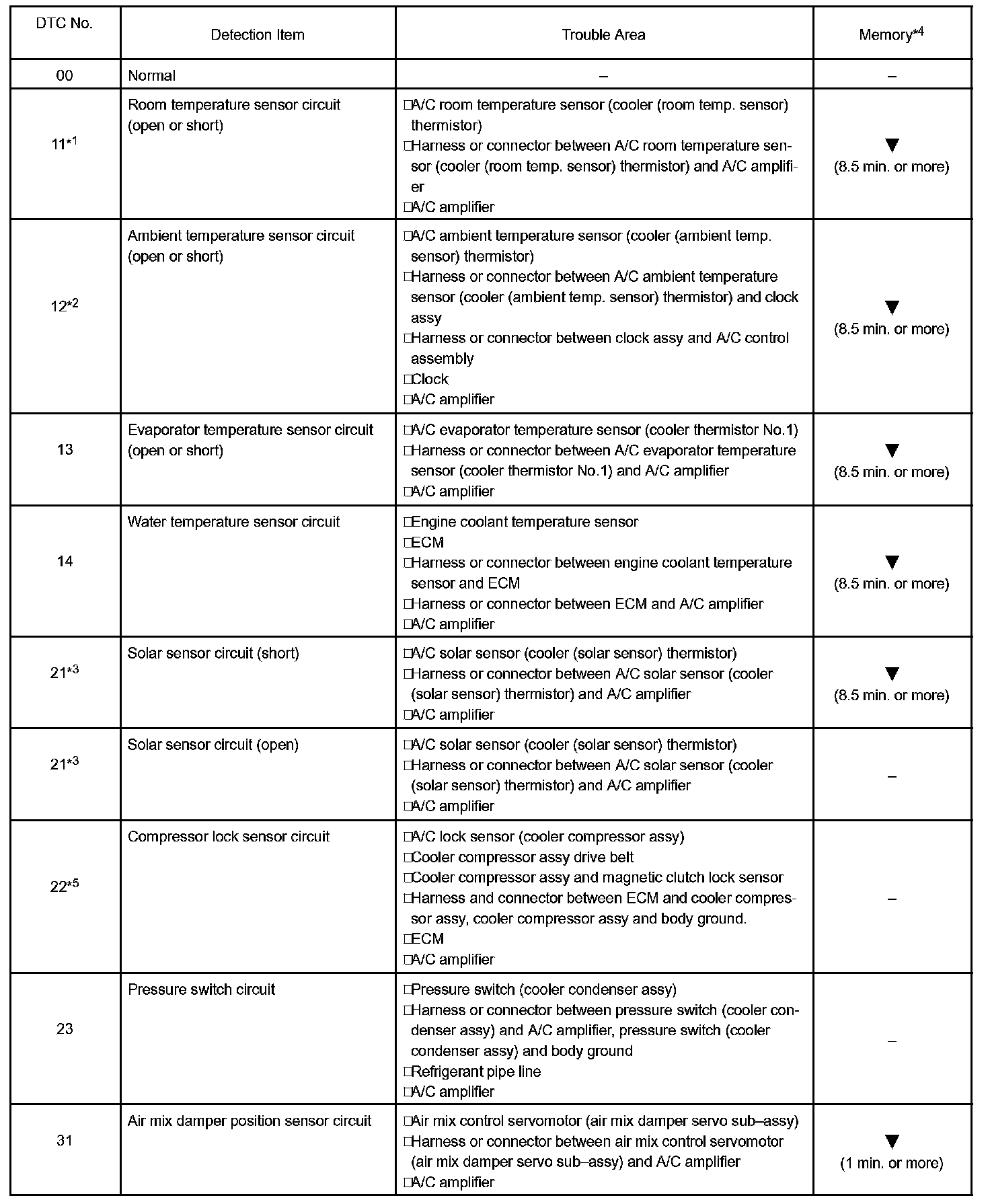 - *4: The A/C amplifier memorizes the DTC of the respective malfunction that has occurred for the period of time indicated in brackets.
