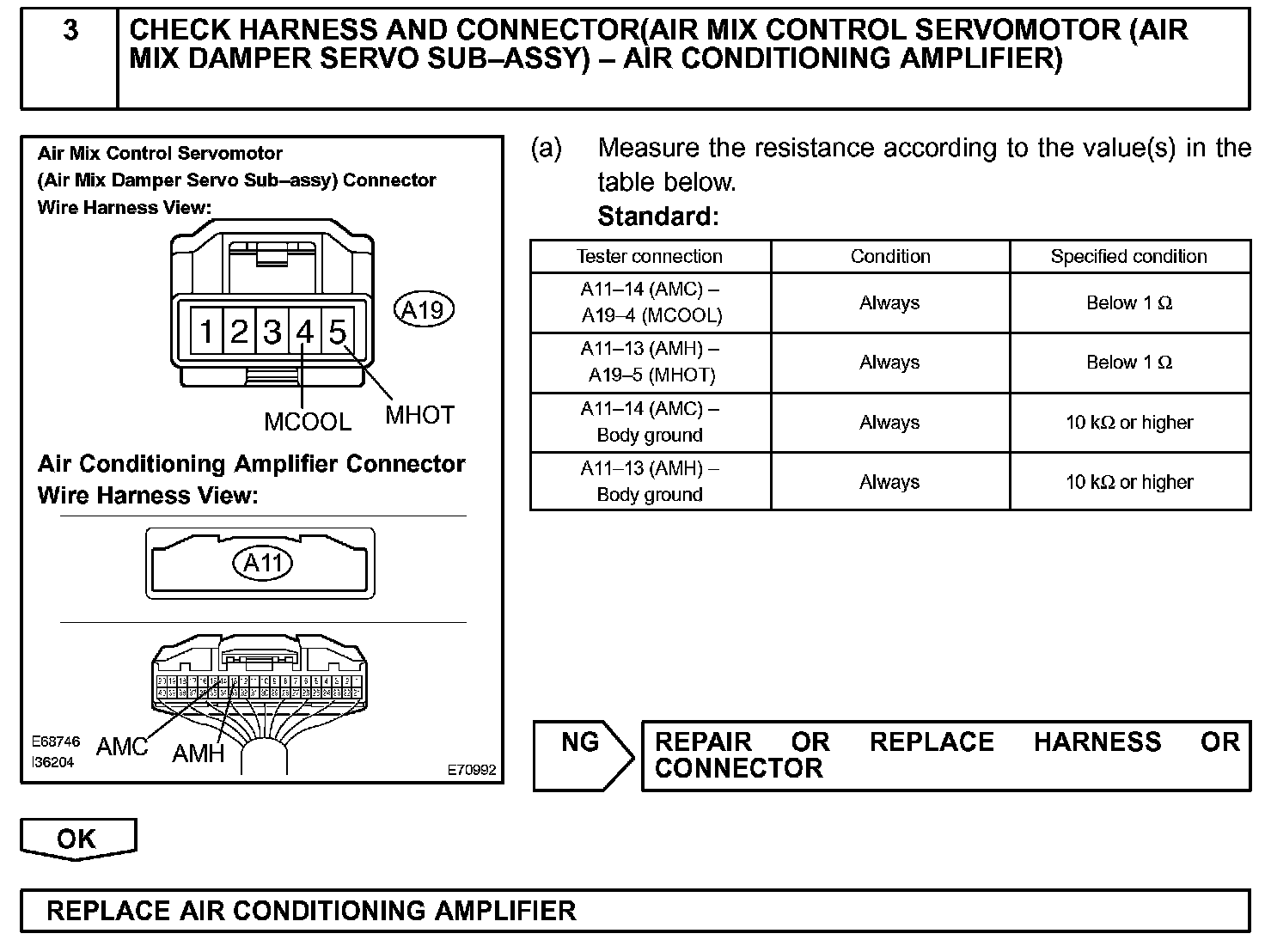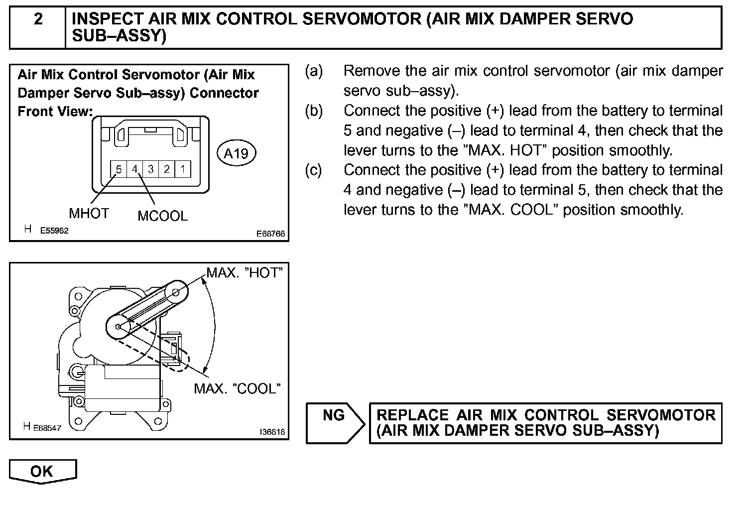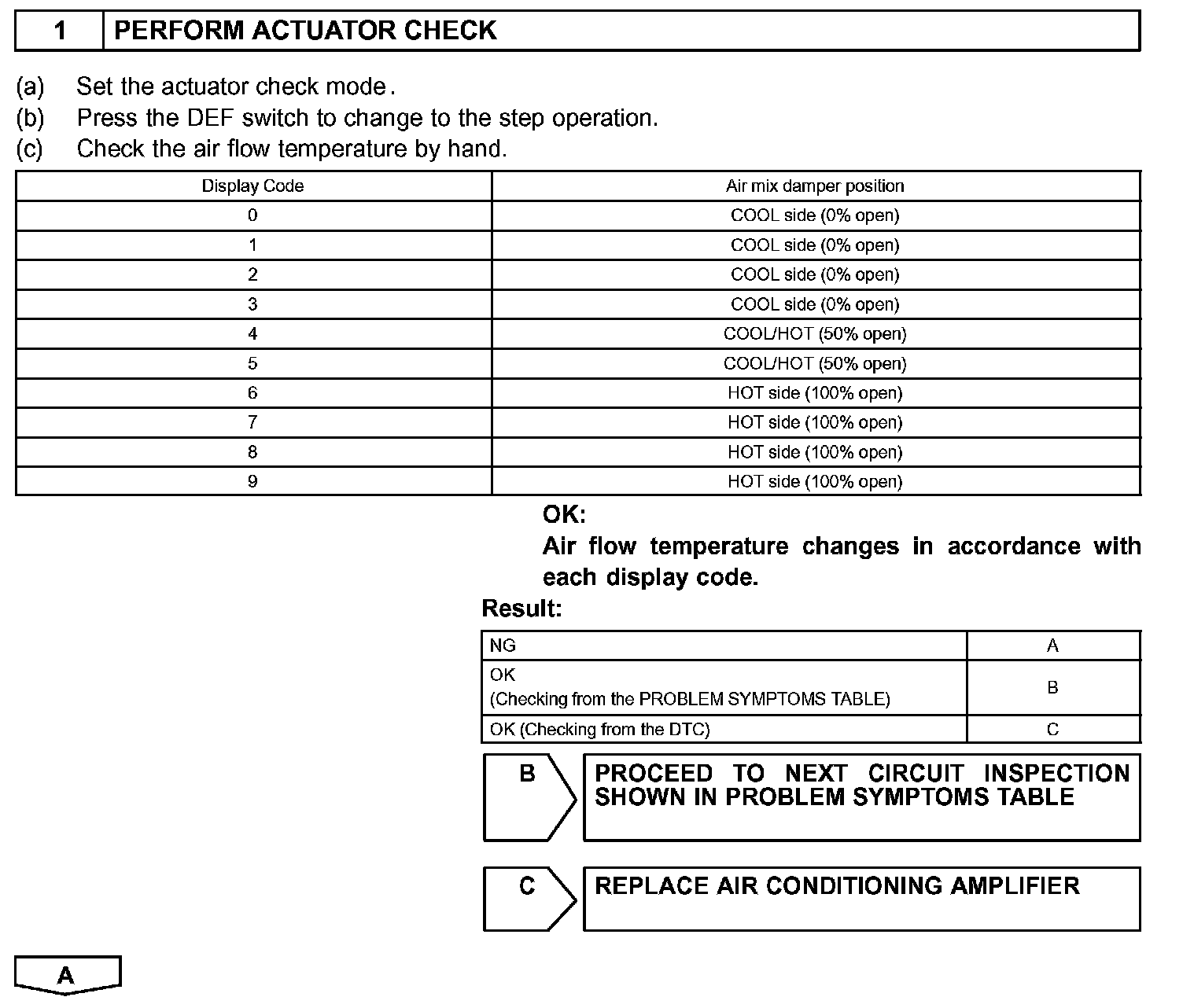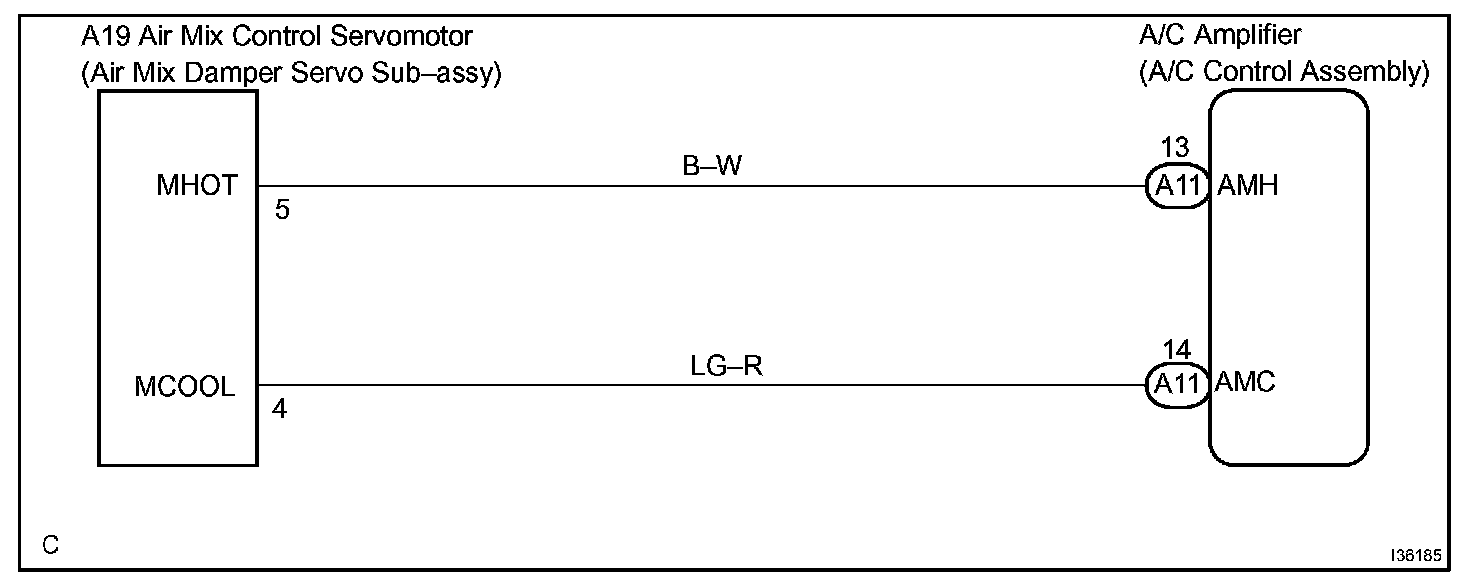 The air mix control servomotor (air mix damper servo sub-assy) is controlled by the A/C amplifier. Air flow temperature changes when moving the air mix damper to the target point. The target point can be detected with the air mix damper position sensor.