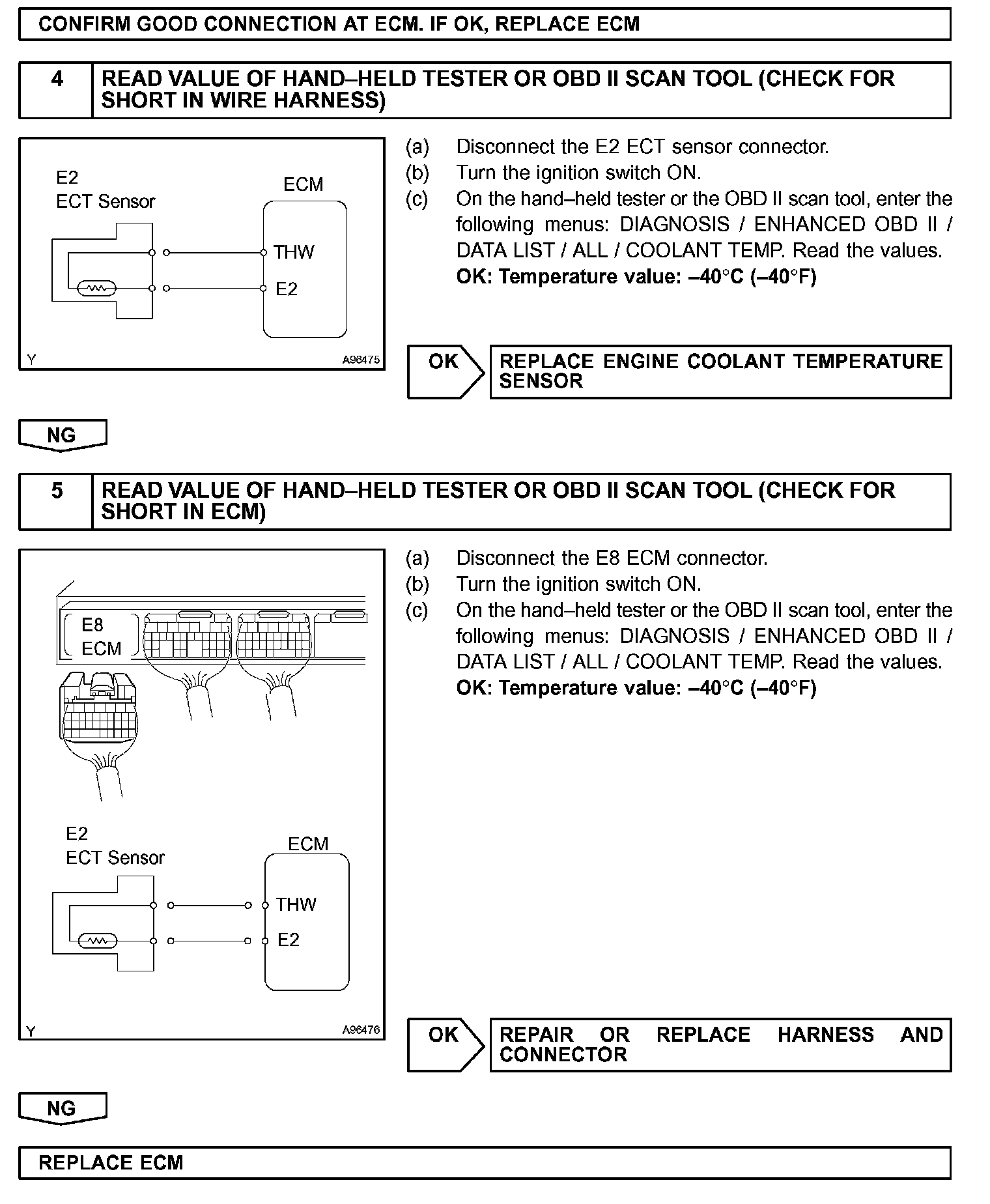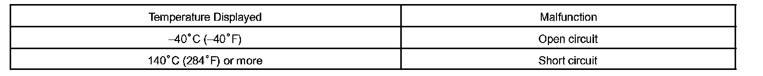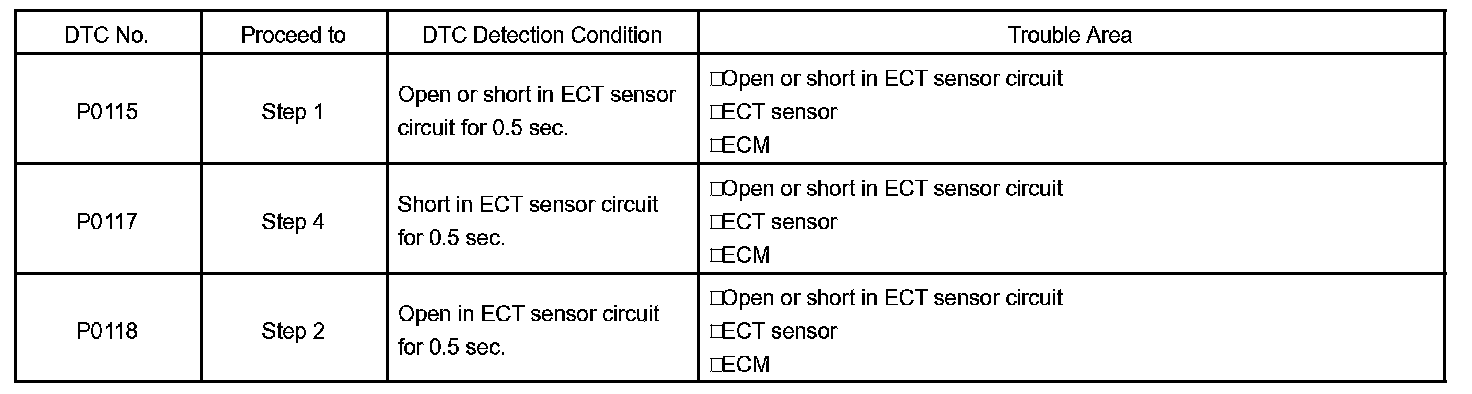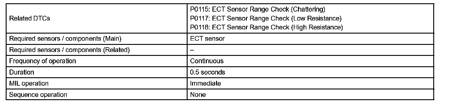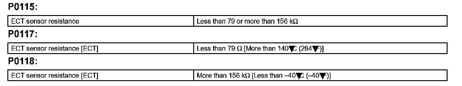 When the ECM calculates that the ECT is -40°C (-40°F) or more than 140°C (284°F) and if either condition continues 0.5 seconds or more, the ECM will set a DTC.