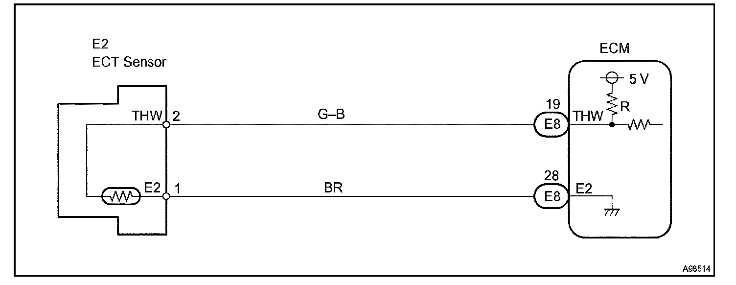 A thermistor is built in the Engine Coolant Temperature (ECT) sensor and changes the resistance value according to the engine coolant temperature.