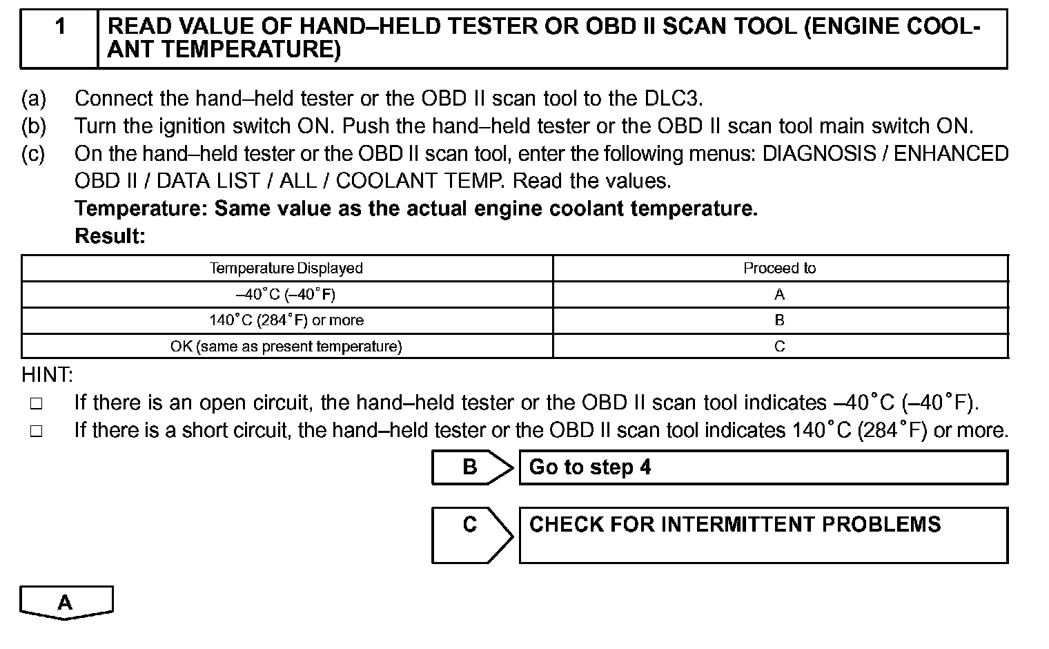 HINT: After confirming DTC P0115, P0117 or P0118, use the hand-held tester or the OBD II scan tool to confirm the ECT from the ALL menu (to reach the ALL menu: DIAGNOSIS / ENHANCED OBD II / DATA LIST / ALL).