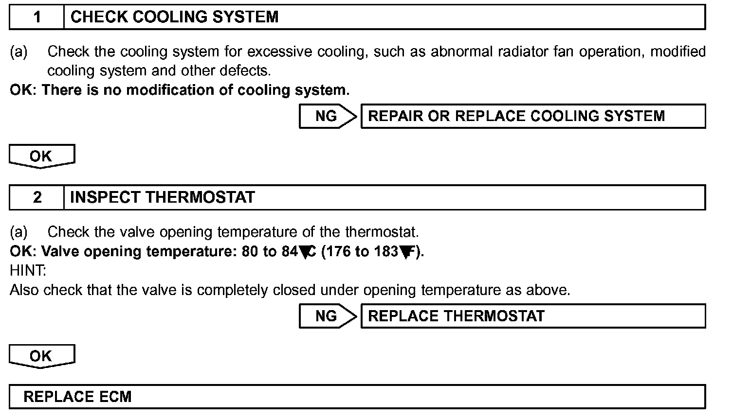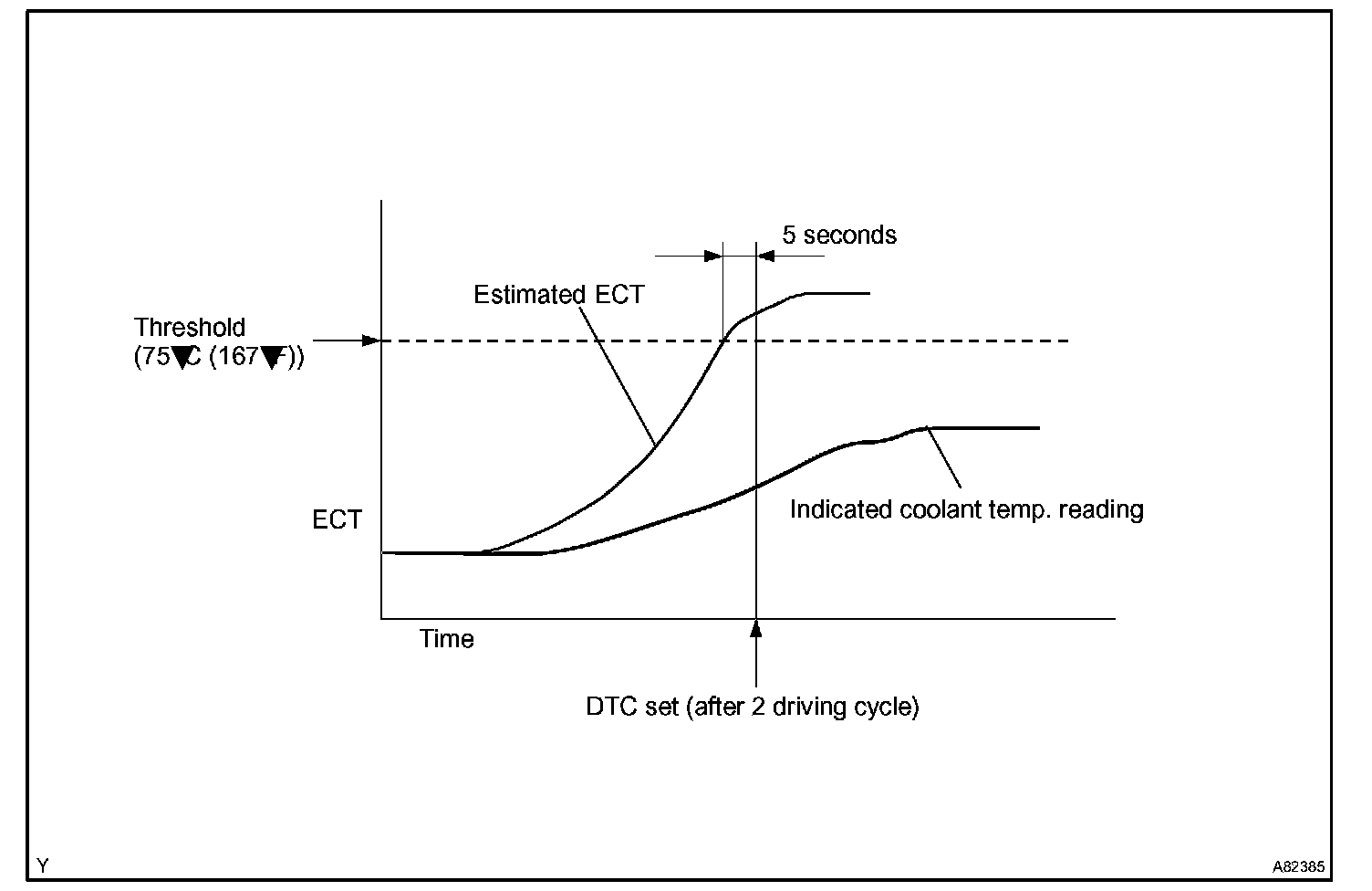 This DTC is output when the Engine Coolant Temperature (ECT) does not reach 75°C (167°F) despite sufficient engine warm-up time.