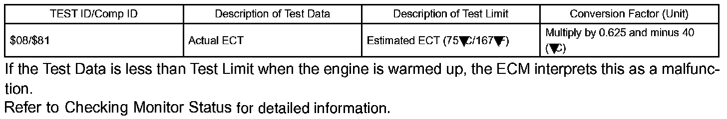 The ECM estimates the coolant temperature based on starting temperature, engine loads, and engine speeds. The ECM then compares the estimated temperature with the actual ECT. When the estimated coolant temperature reaches 75°C (167°F), the ECM checks the actual ECT. If the actual ECT is less than 75°C (167°F), the ECM will interpret this as a fault in thermostat or the engine cooling system and set a DTC.