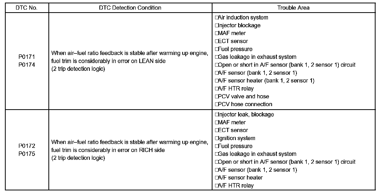 - When DTC P0171 or P0174 is recorded, the actual air-fuel ratio is on the LEAN side. When DTC P0172 or P0175 is recorded, the actual air-fuel ratio is on the RICH side.