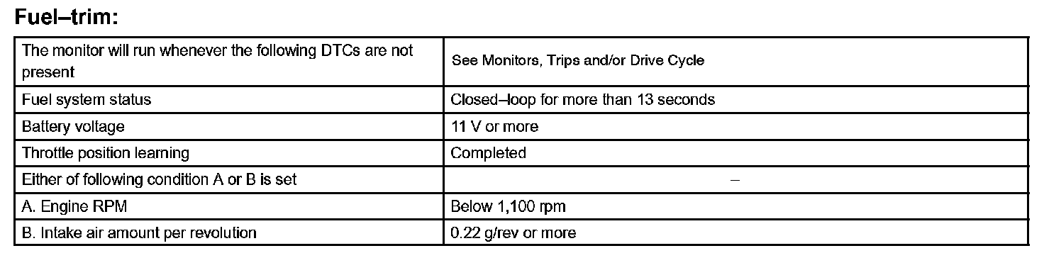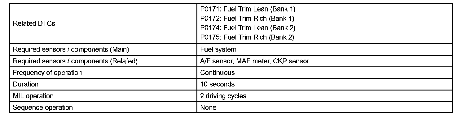 If both the short-term fuel trim and the long-term fuel trim are LEAN or RICH beyond a certain value, it is detected as a malfunction and the MIL is illuminated and a DTC is set.