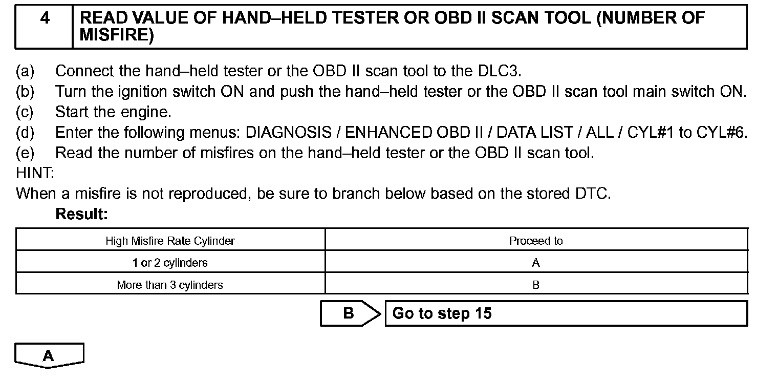 d. Read the value on the misfire counter for each cylinder when idling. If the value is displayed on the misfire counter, skip the following procedure of confirmation driving.