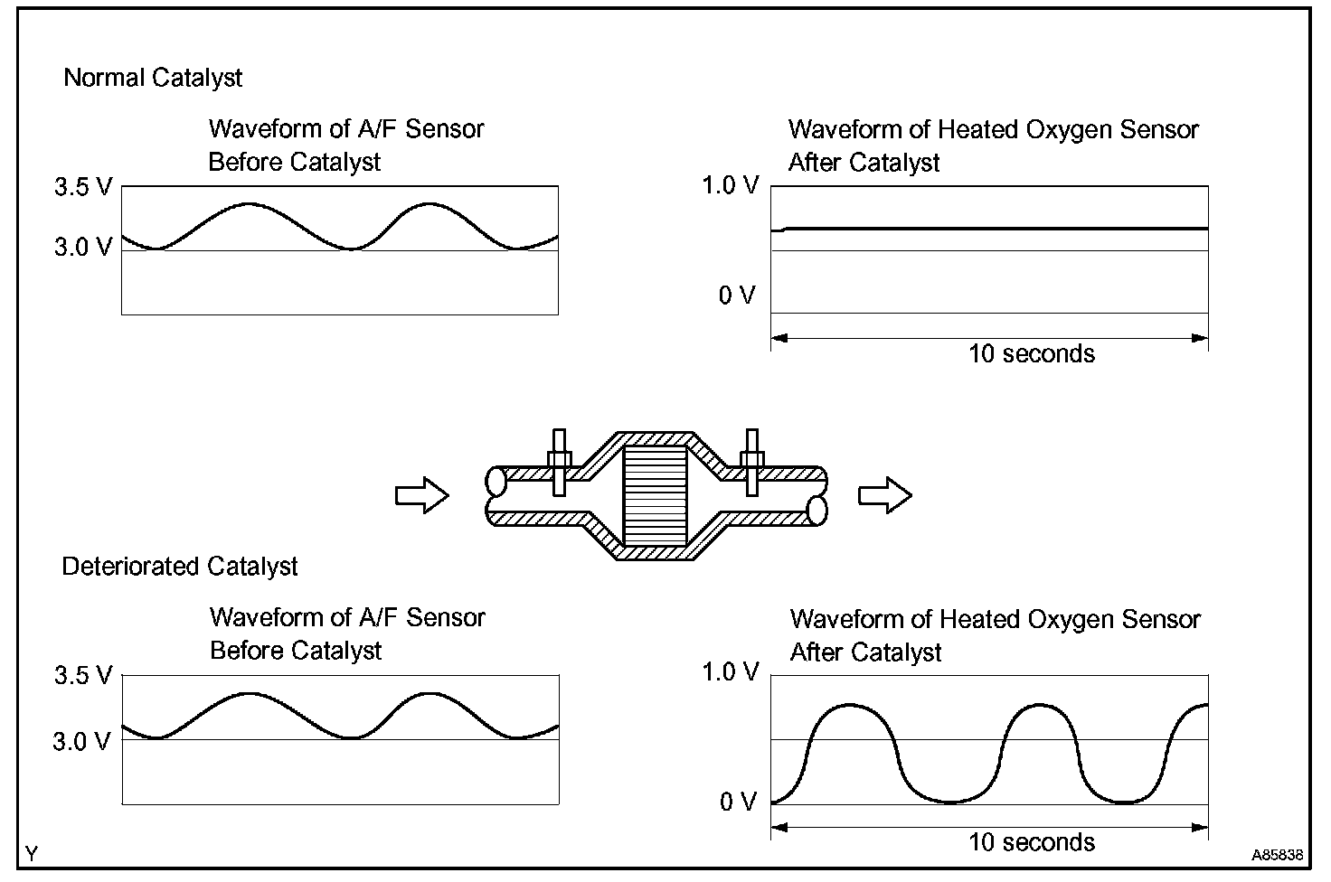 If the catalyst is functioning normally, the waveform of the heated oxygen sensor slowly switches between RICH and LEAN. If the catalyst is deteriorated, the waveform will alternate frequently between RICH and LEAN. As the catalyst efficiency degrades, its ability to store oxygen is reduced and the catalyst output becomes more variable.