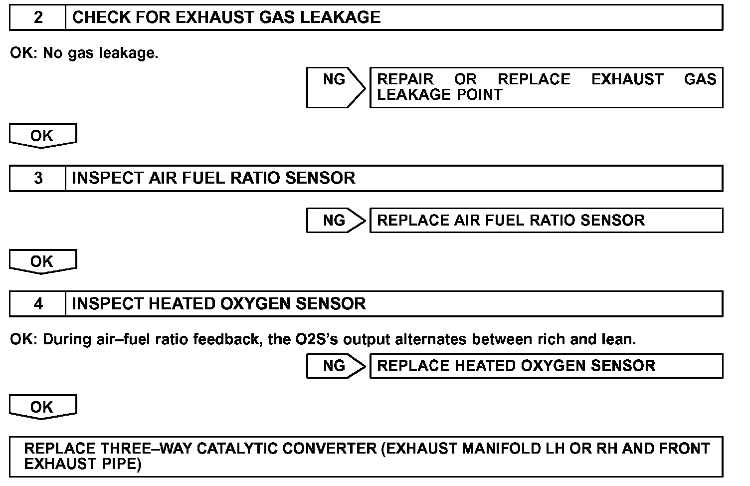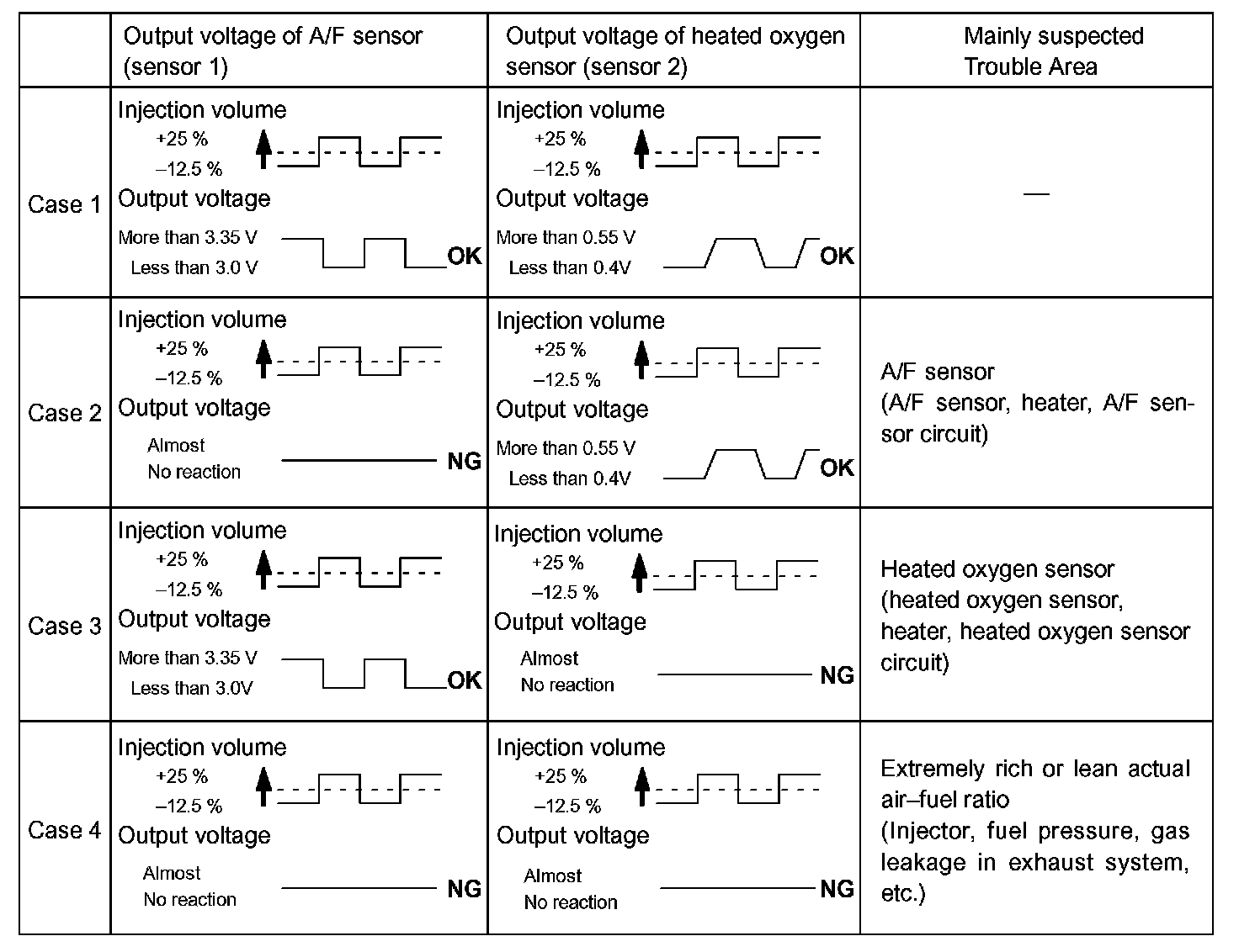 - The following procedure enables the technician to identify a trouble area if malfunction in A/F sensors front or rear heated oxygen sensors other than the catalyst converter, or the malfunction that indicates the actual air-fuel ratio extremely RICH or LEAN.