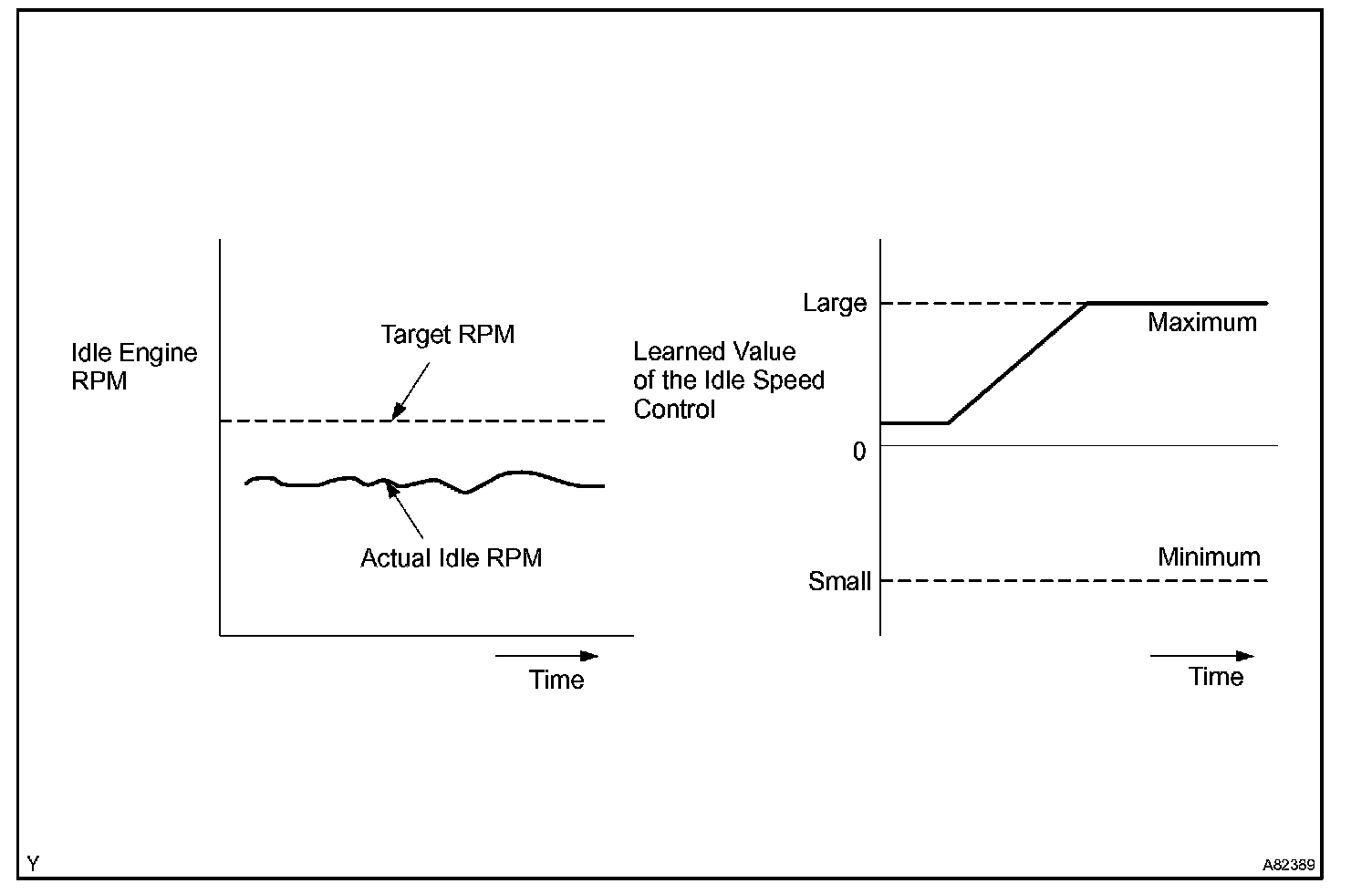 The ECM regulates the idle speed by opening and closing the throttle valve using the ETCS. The ECM concludes that the idle speed control ECM function is malfunctioning if: 1) the actual idle RPM varies more than the specified amount 5 times or more during a drive cycle, or 2) a learned value of the idle speed control remains at the maximum or minimum 5 times or more during a drive cycle. The ECM will turn on the MIL and set a DTC.