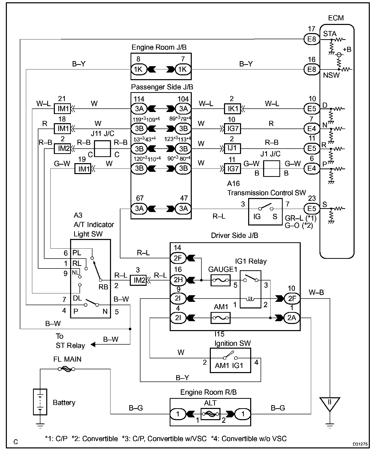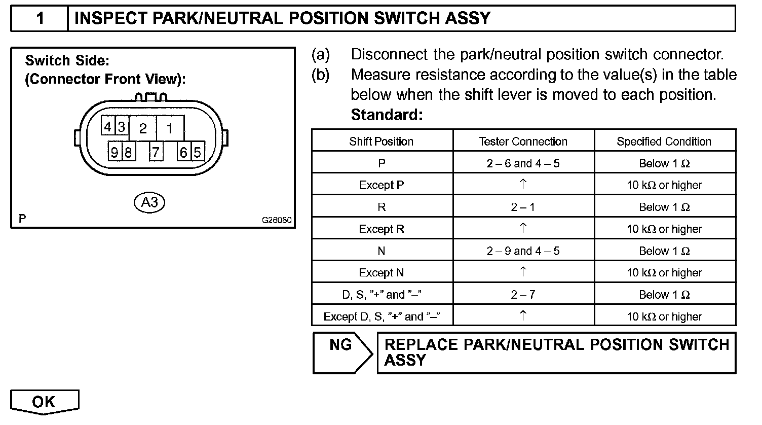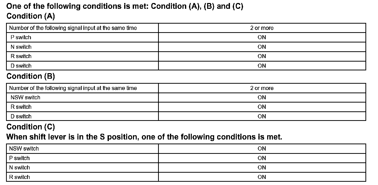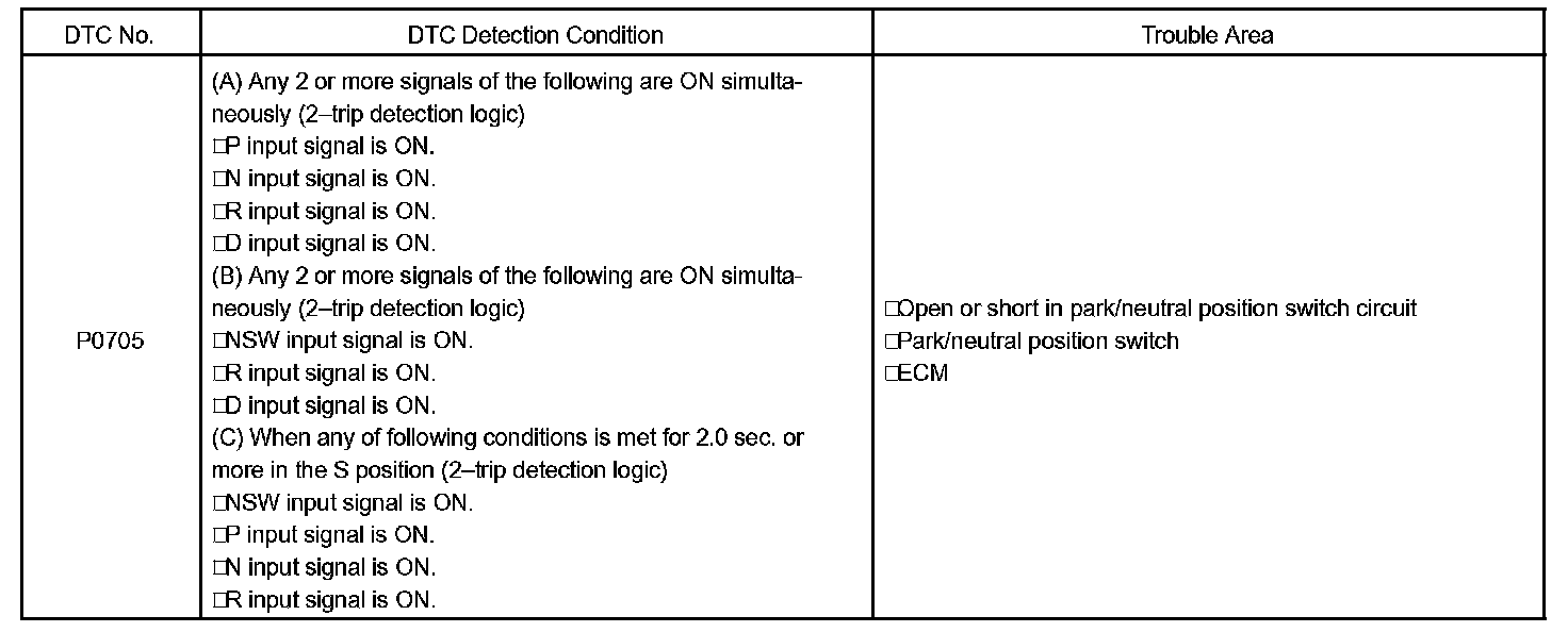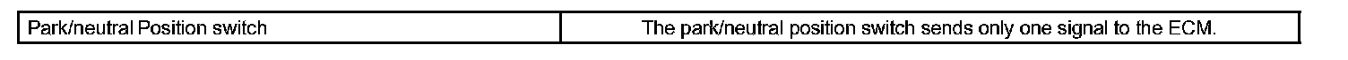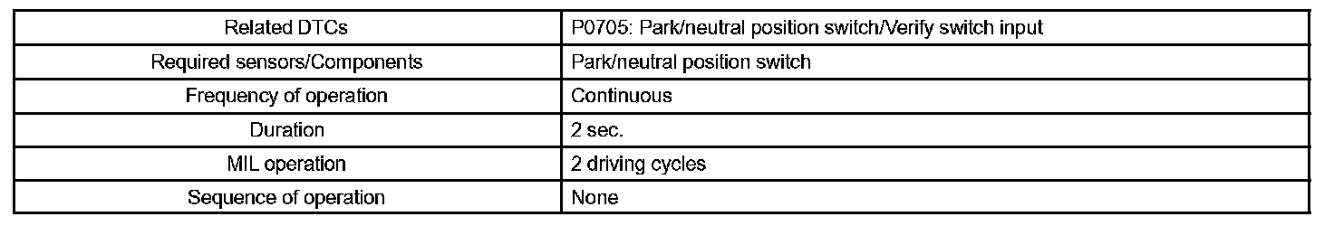 When the park/neutral position switch sends more than one signal at a time from switch positions P, R, N or D, the ECM interprets this as a fault in the switch. The ECM will turn on the MIL and store the DTC.