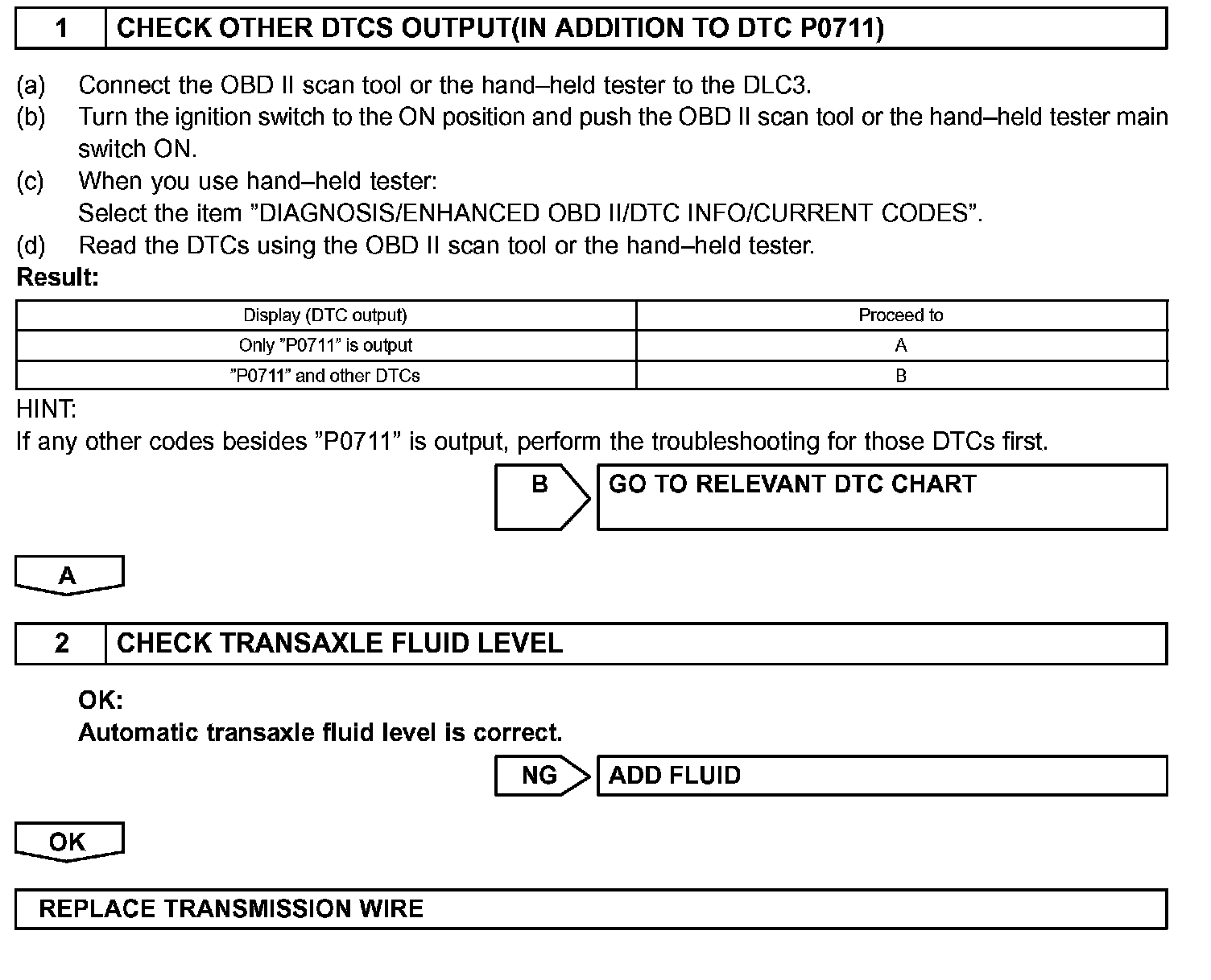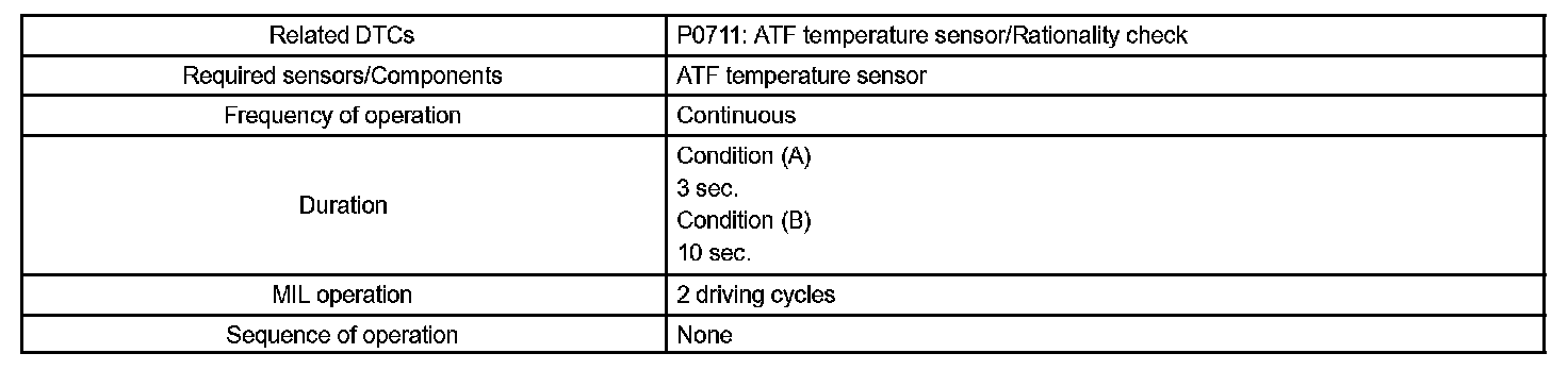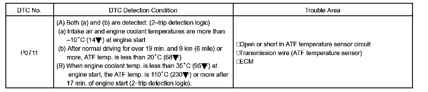 HINT: If a circuit related to the ATF temperature sensor becomes open, P0713 is immediately set (in 0.5 second). When P0713 is set, P0711 cannot be detected.