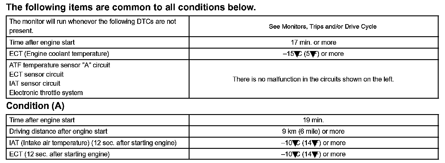 After running the vehicle for a certain period, the ATF temperature should increase. If the ATF temperature is below 10 °C (50 °F) after running the vehicle for a certain period, the ECM interprets this as a fault, and turns on the MIL.