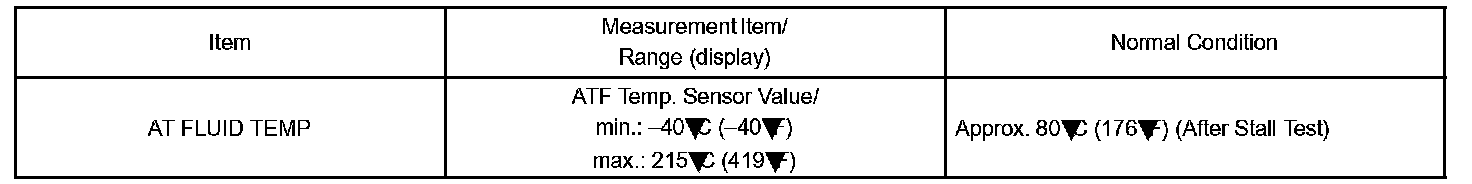 The ATF temperature sensor converts the ATF temperature to an electrical resistance value. Based on the resistance, the ECM determines the ATF temperature and detects an opens or shorts in the ATF temperature circuit or a fault of the ATF temperature sensor.