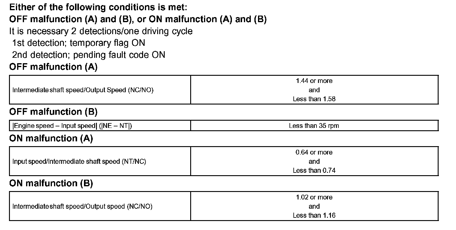 The ECM commands gear shifts by turning the shift solenoid valves "ON/OFF". According to the input shaft revolution, intermediate (counter) shaft revolution and output shaft revolution, the ECM detects the actual gear position (1st, 2nd, 3rd, 4th or 5th gear position). When the gear position commanded by the ECM and the actual gear position are not same, the ECM illuminates the MIL and stores the DTC.