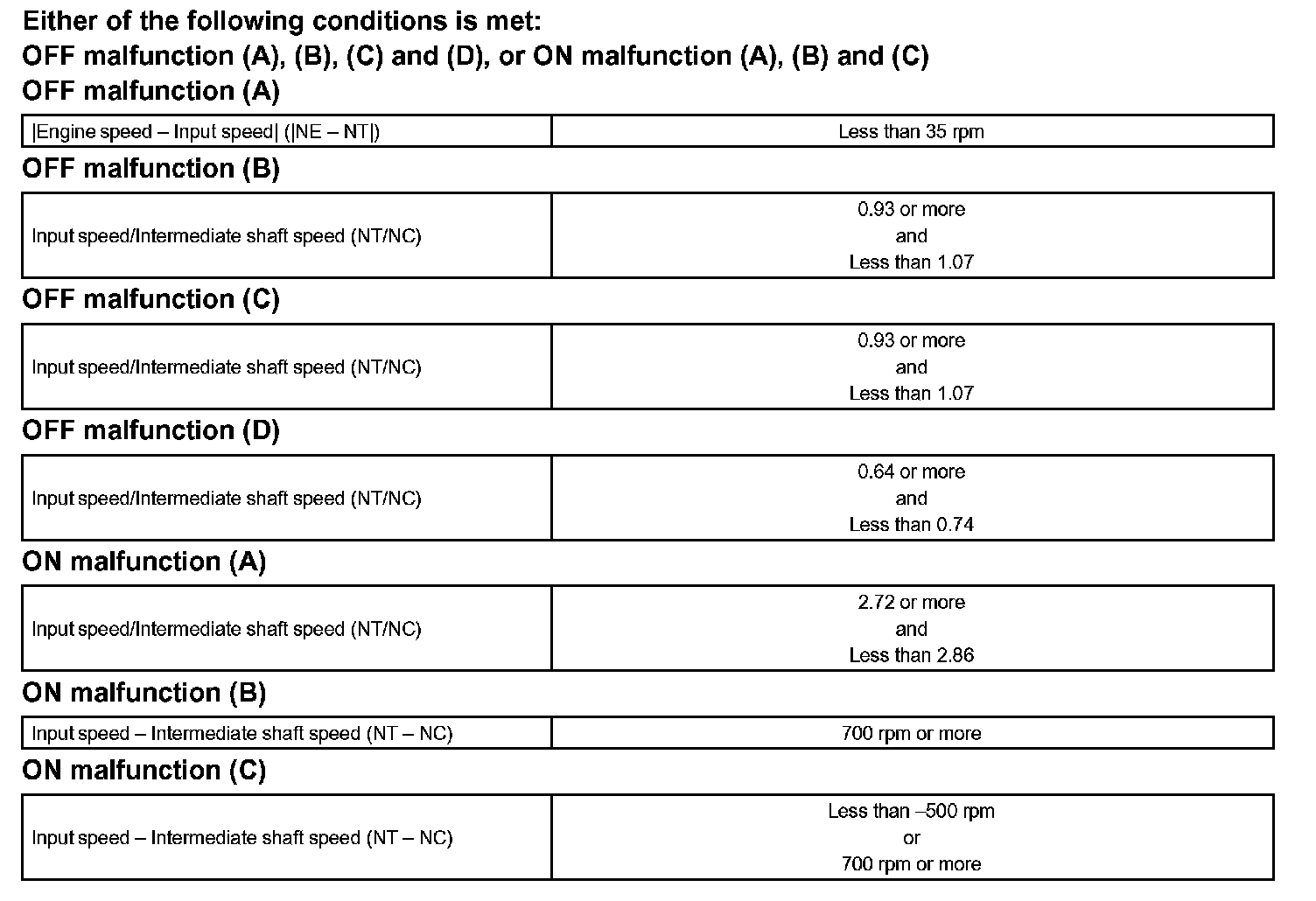 The ECM commands gear shifts by turning the shift solenoid valves "ON/OFF". According to the input shaft revolution, intermediate (counter) shaft revolution and output shaft revolution, the ECM detects the actual gear position (1st, 2nd, 3rd, 4th or 5th gear position). When the gear position commanded by the ECM and the actual gear position are not same, the ECM illuminates the MIL and stores the DTC.