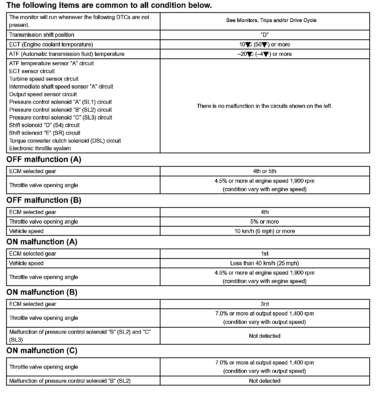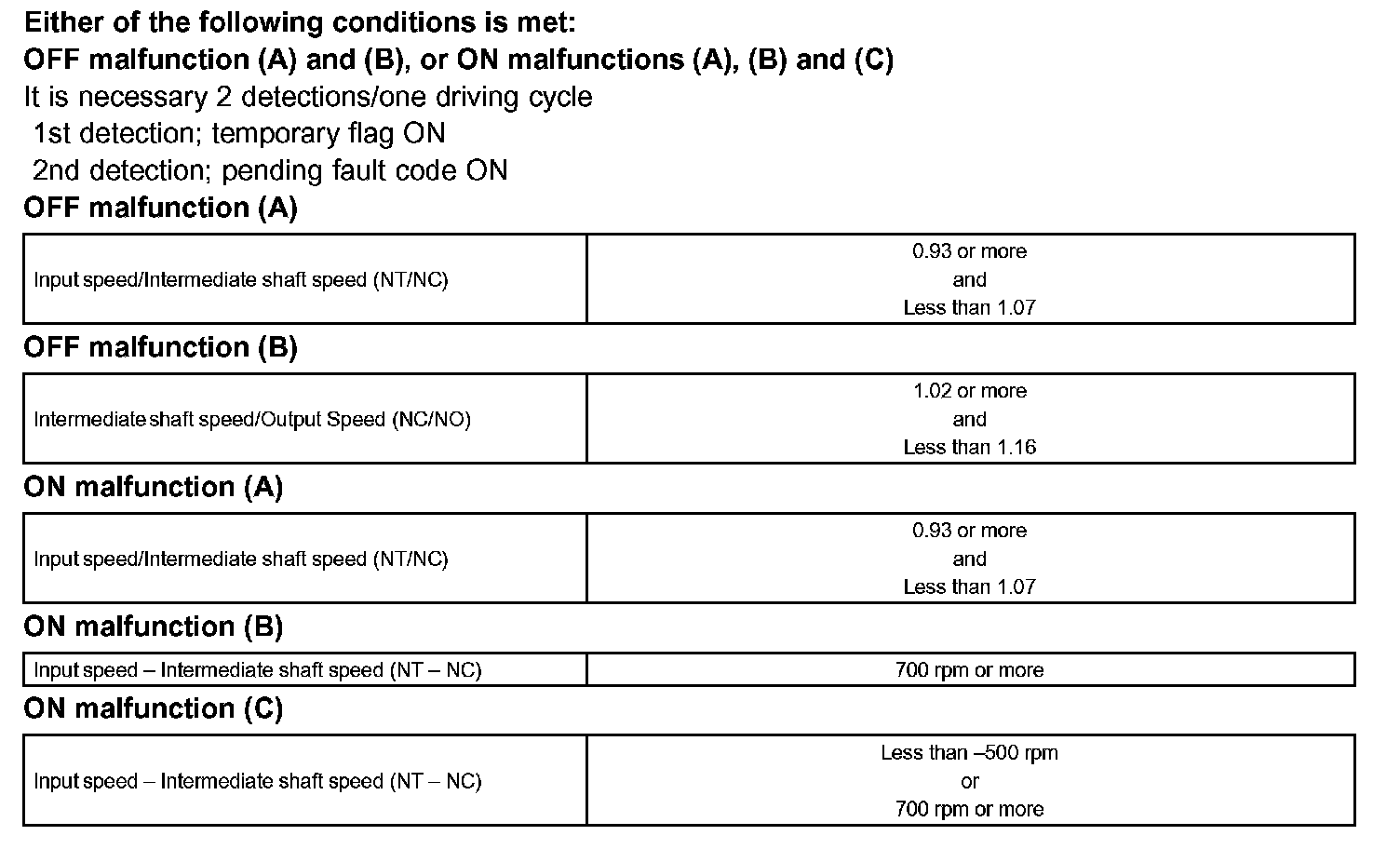 The ECM commands gear shifts by turning the shift solenoid valves "ON/OFF". According to the input shaft revolution, intermediate (counter) shaft revolution and output shaft revolution, the ECM detects the actual gear position (1st, 2nd, 3rd, 4th or 5th gear position). When the gear position commanded by the ECM and the actual gear position are not same, the ECM illuminates the MIL and stores the DTC.