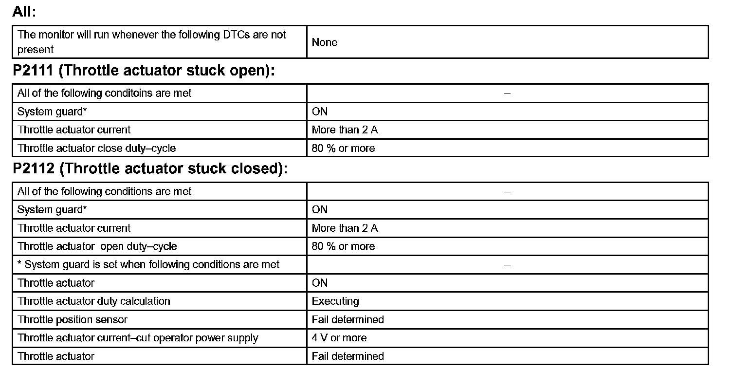 The ECM concludes that there is a malfunction of the ETCS when the throttle valve remains at a fixed angle despite high drive current from the ECM. The ECM will turn on the MIL and a DTC is set.