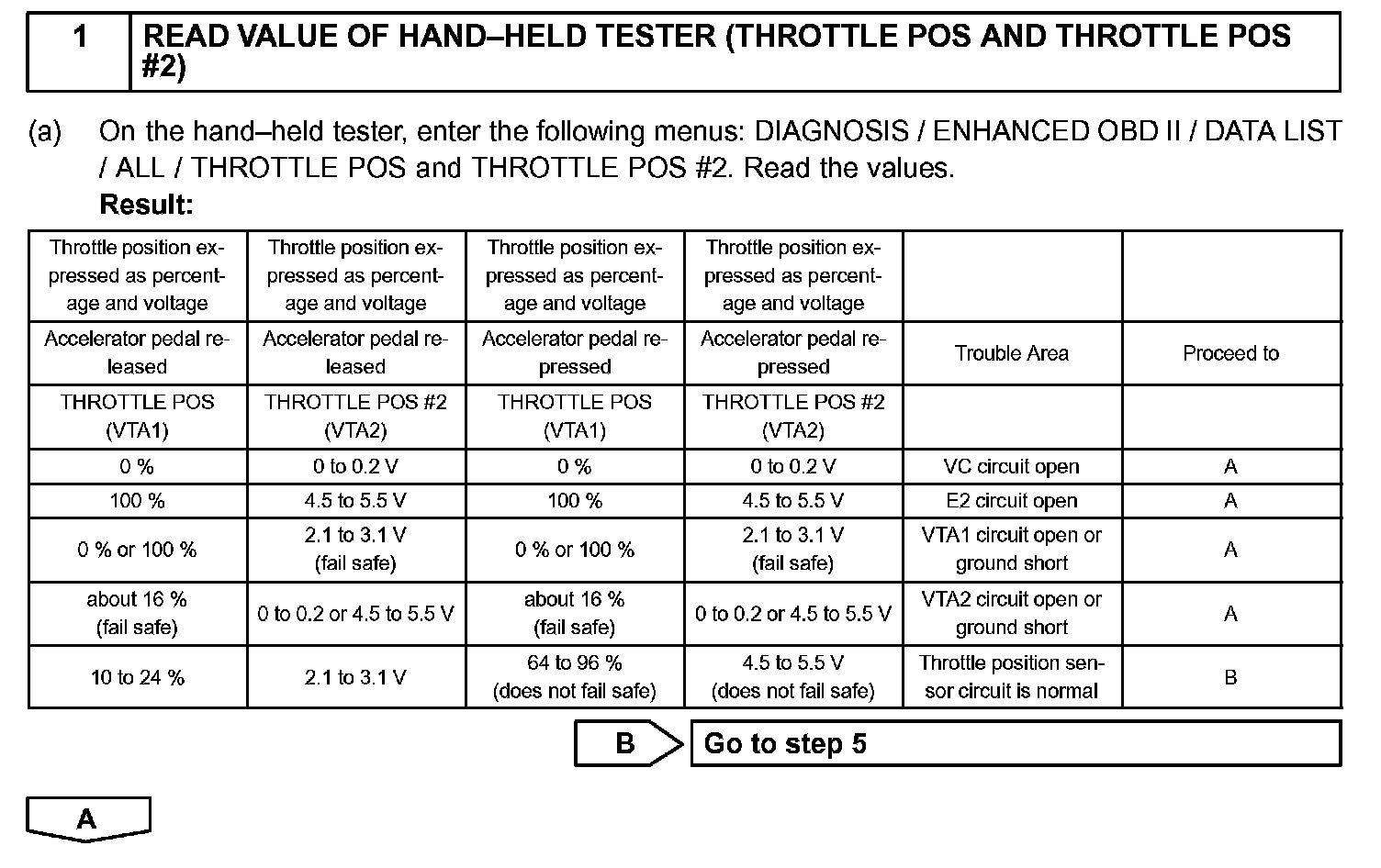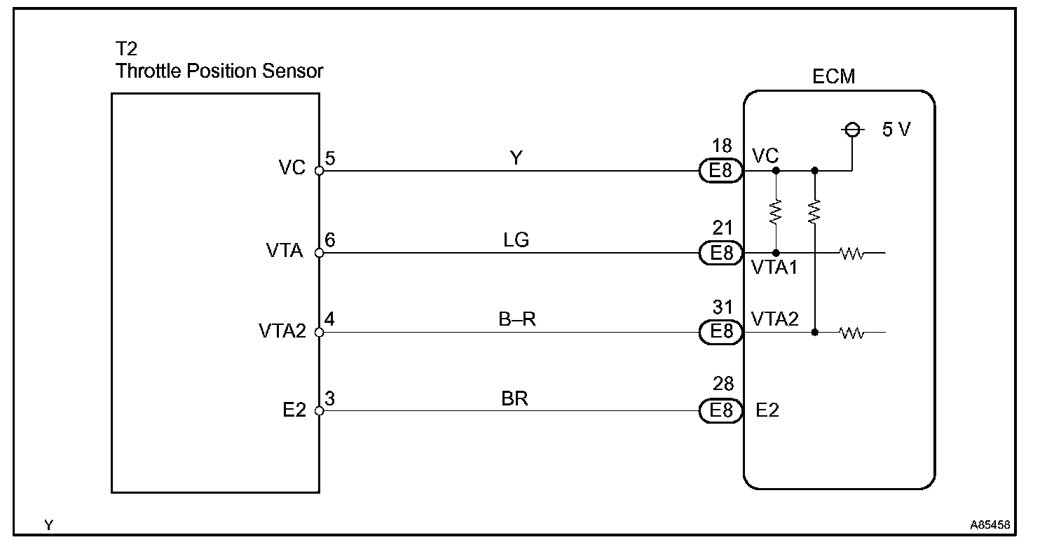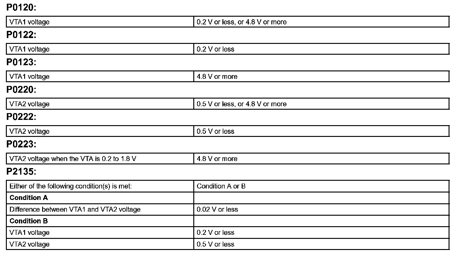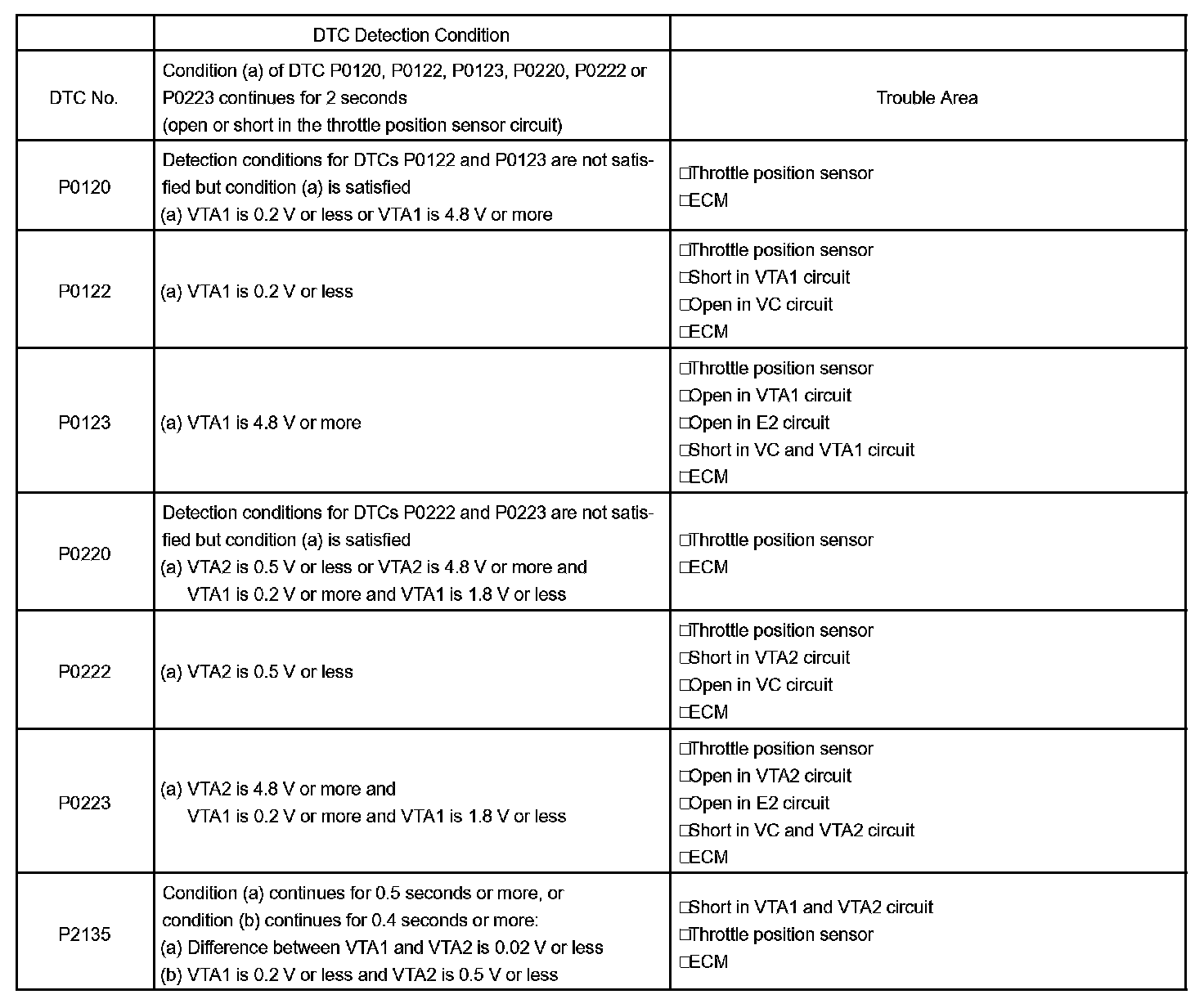 - If VTA1 is within 0.02 V of VTA2, the ECM interprets this as a short circuit in the throttle position sensor system and will set a DTC.
