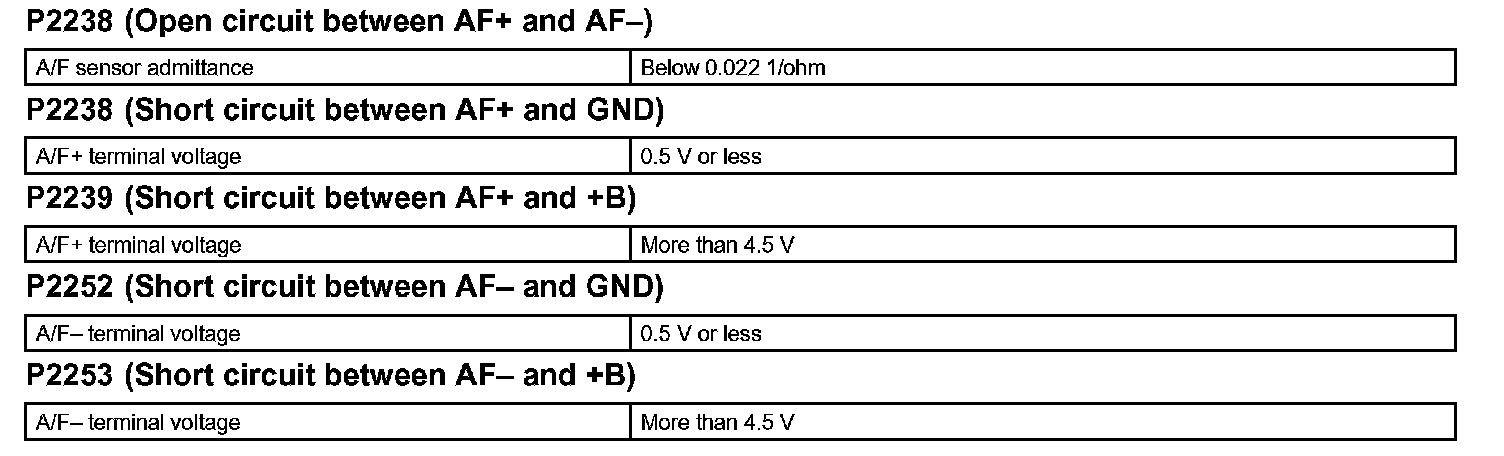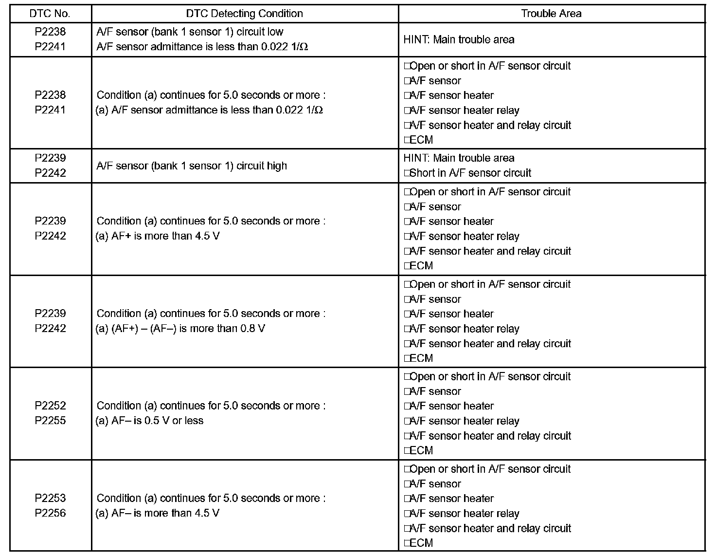 - DTC P2237, P2238, P2239, P2251, P2252 and P2253 refer to the malfunction related to the bank 1 A/F sensor circuit.