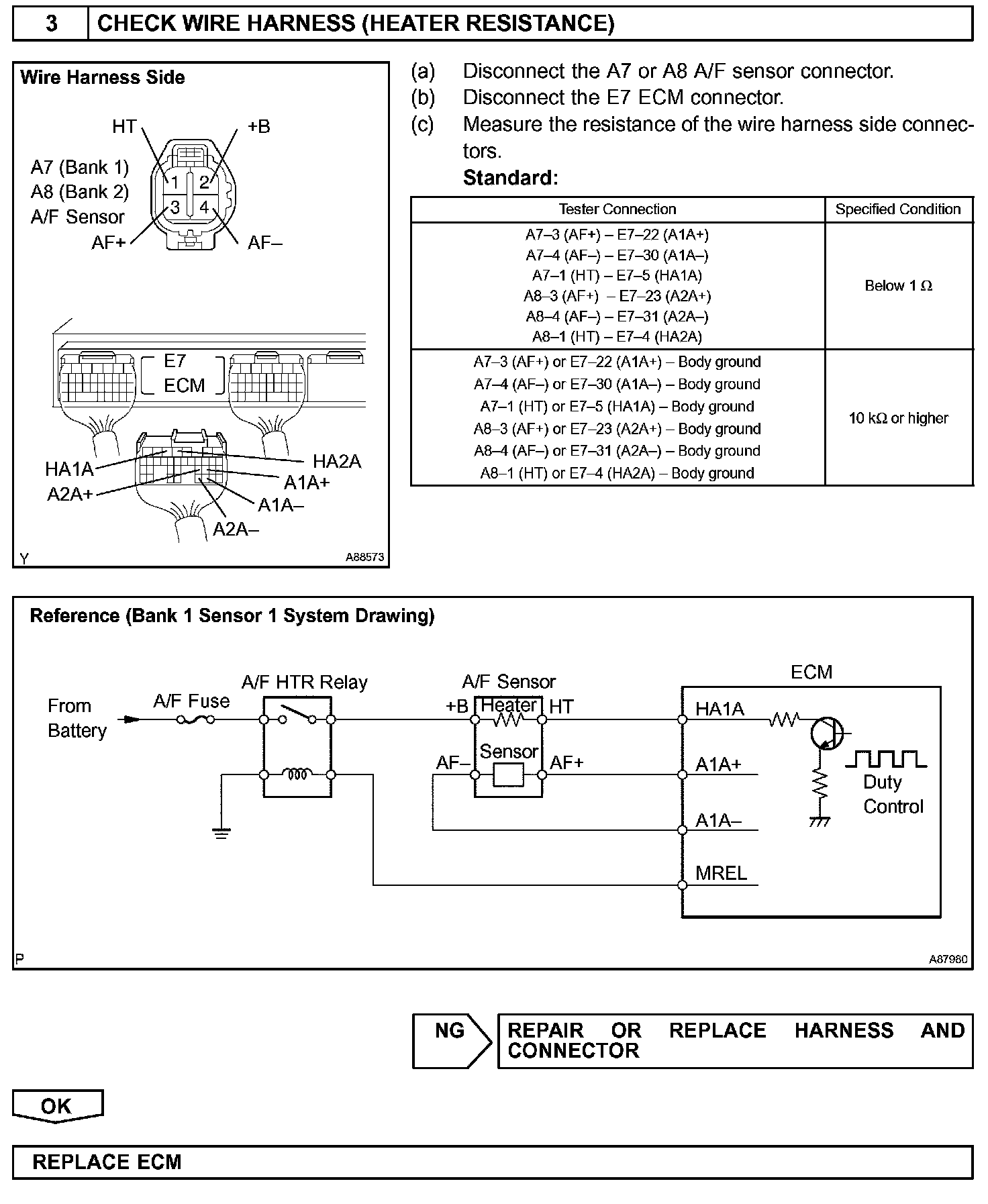 The air-fuel ratio (A/F) sensor varies its voltage output in proportion to the air-fuel ratio. If impedance (alternating current resistance) or voltage output of the sensor deviates greatly from the standard, the ECM determines if an open or short malfunction is in the A/F sensor circuit.