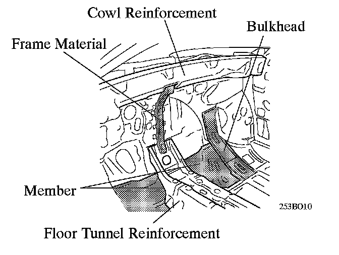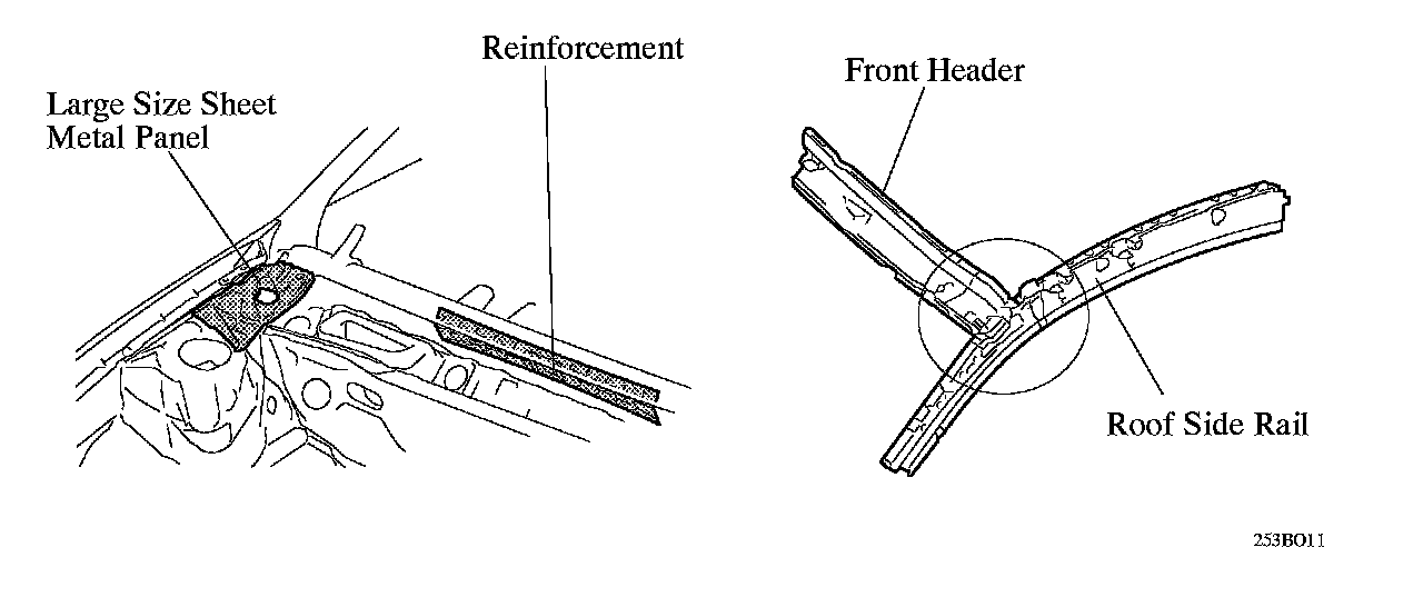(3) To prevent the windshield glass from vibrating, a reinforcement has been adopted in the cowl, and the joining of the front header and the roof side rail has been made more rigid.