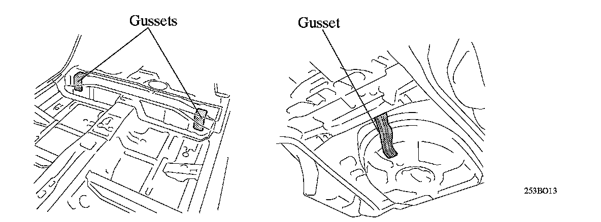 (6) Gussets connect the front floor panel, center floor panel, and the center floor cross member in order to reduce the torsion of the front floor and the center floor and suppress vibration.